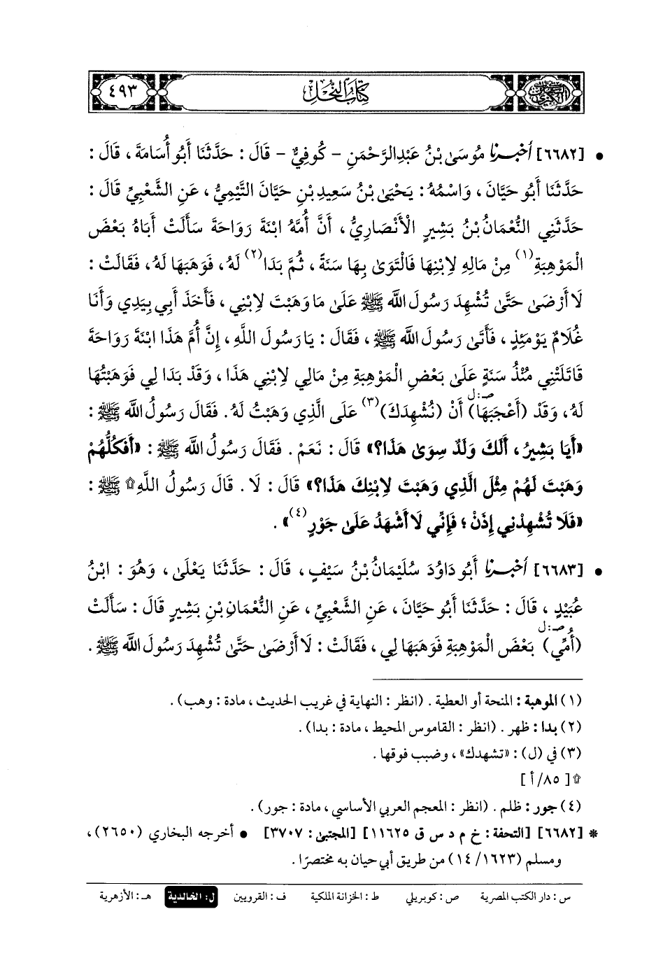 6682- أَخبَرنا مُوسَى بنُ عَبدِ الرَّحمَنِ كوفي، قَالَ: حَدثنا أَبو أُسَامَةَ، قَالَ: حَدثنا أَبو حَيَّانَ، وَاسْمُهُ: يَحيَى بنُ سَعِيدِ بنِ حَيَّانَ التَّيْمِيُّ، عَنِ الشَّعْبِيِّ، قَالَ: حَدَّثني النُّعْمَانُ بنُ بَشِيرٍ الأَنْصَارِيُّ، أَنَّ أُمَّهُ ابنَةَ رَوَاحَةَ، سَأَلَتْ أَبَاهُ بَعْضَ المَوْهِبَةِ مِنْ مَالِهِ لاِبْنِهَا، فَالتَوَى بِهَا سَنَةً، ثُمَّ بَدَا لَهُ فَوَهَبَهَا لَهُ، فَقَالَتْ: لا أَرْضَى حَتَّى تُشْهِدَ رَسُولَ اللهِ صَلى الله عَليه وسَلم عَلَى مَا وَهَبْتَ لاِبْنِي، فَأَخَذَ أَبي بِيَدِي، وَأَنَا غُلامٌ يَوْمَئِذٍ، فَأَتَى رَسُولَ اللهِ صَلى الله عَليه وسَلم، فَقَالَ: يَا رَسُولَ اللهِ، إِنَّ أُمَّ هَذَا ابنَةَ رَوَاحَةَ قَاتَلَتْنِي مُنْذُ سَنَةٍ عَلَى بَعْضِ المَوْهِبَةِ مِنْ مَالِي لاِبْنِي هَذَا، وَقَدْ بَدَا لِي فَوَهَبْتُهَا لَهُ، وَقَدْ أَعْجَبَهَا أَنْ أُشْهِدَكَ عَلَى الَّذِي وَهَبْتُ لَهُ، فَقَالَ رَسُولُ اللهِ صَلى الله عَليه وسَلم: أَيَا بَشِيرُ، أَلَكَ وَلَدٌ سِوَى هَذَا؟ قَالَ: نَعَمْ، فَقَالَ رَسُولُ اللهِ صَلى الله عَليه وسَلم: أَفَكُلُّهُمْ وَهَبْتَ لَهُمْ مِثْلَ الَّذِي وَهَبْتَ لاِبْنِكَ هَذَا؟ قَالَ: لا، قَالَ رَسُولُ اللهِ صَلى الله عَليه وسَلم: فَلا تُشْهِدْنِي إِذًا، فَإِنِّي لا أَشْهَدُ عَلَى جَوْرٍ.