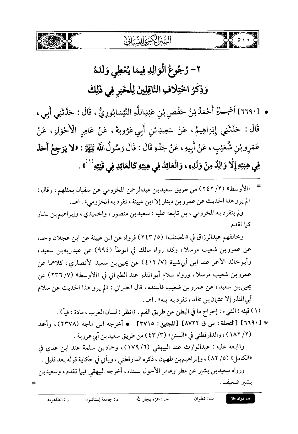 6690- أَخبَرنا أَحْمَدُ بنُ حَفْصِ بنِ عَبدِ اللهِ النَّيْسَابُورِيُّ، قَالَ: حَدَّثني أَبي، قَالَ: حَدَّثني إِبرَاهِيمُ، عَن سَعِيدِ بنِ أَبي عَرُوبَةَ، عَن عَامِرٍ الأَحْوَلِ، عَن عَمْرِو بنِ شُعَيْبٍ، عَن أَبيهِ، عَن جَدِّهِ قَالَ: قَالَ رَسُولُ اللهِ صلى الله عليه وسلم: لا يَرْجِعُ أَحَدٌ فِي هِبَتِهِ إِلاَّ وَالِدٌ مِنْ وَلَدِهِ، وَالعَائِدُ فِي هِبَتِهِ كَالعَائِدِ فِي قَيْئِهِ.