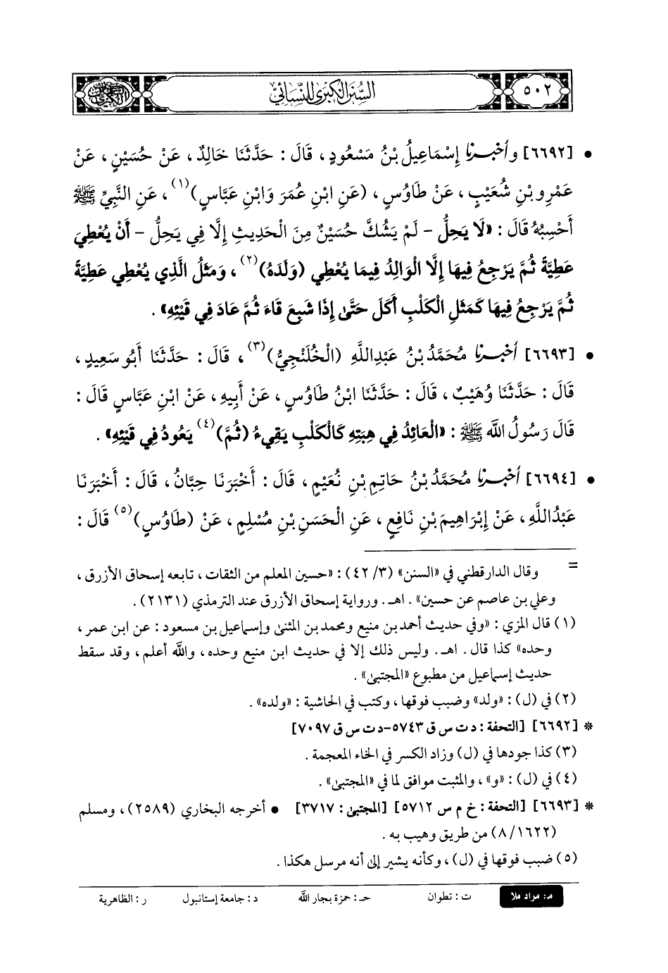 6694- أَخبَرنا مُحَمدُ بنُ حَاتِمِ بنِ نُعَيْمٍ، قَالَ: أَخبَرنا حِبَّانُ، قَالَ: أَخبَرنا عَبدُ اللهِ، عَن إِبرَاهِيمَ بنِ نَافِعٍ، عَنِ الحَسَنِ بنِ مُسْلِمٍ، عَن طَاوُوسٍ، قَالَ: قَالَ رَسُولُ اللهِ صَلى الله عَليه وسَلم: لا يَحِلُّ لأَحَدٍ أَنْ يَهَبَ هِبَةً، ثُمَّ يَرْجِعَ فِيهَا، إِلاَّ مِنْ وَلَدِهِ، قَالَ طَاوُوسٌ: كُنْتُ أَسْمَعُ وَأَنَا صَغِيرٌ: عَائِدٌ فِي قَيْئِهِ، لَمْ أَكُنْ أَظُنُّ أَنَّهُ ضَرَبَ لَهُ مَثَلاً، قَالَ: فَمَنْ فَعَلَ ذَلِكَ فَمَثَلُهُ كَمَثَلِ الكَلْبِ، يَأْكُلُ، ثُمَّ يَقِيءُ، ثُمَّ يَعُودُ فِي قَيْئِهِ.