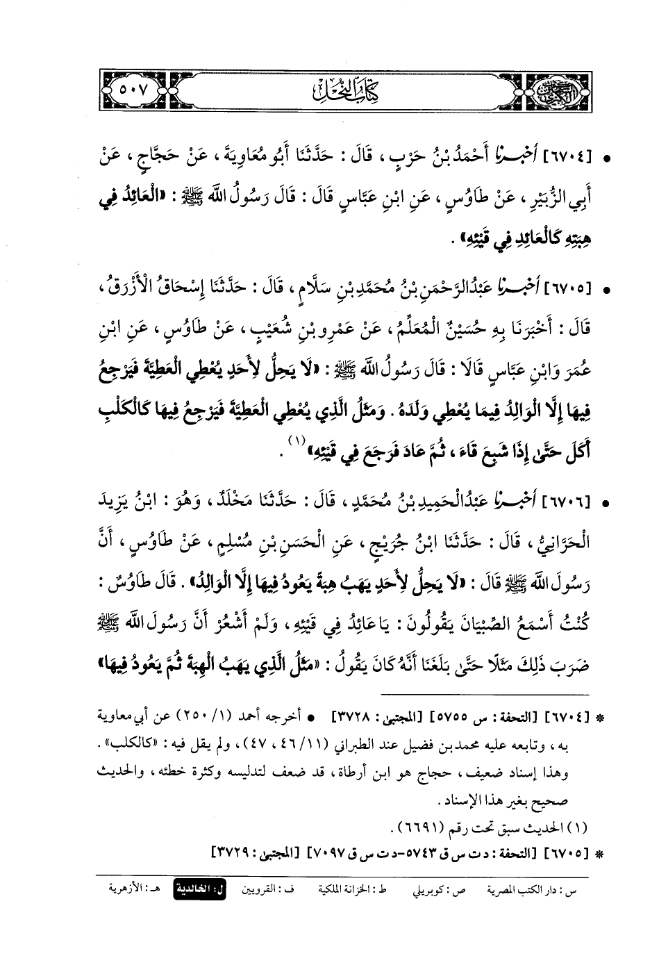 6704- أَخبَرنا أَحْمَدُ بنُ حَرْبٍ، قَالَ: حَدثنا أَبو مُعاويَةَ، عَن حَجَّاجٍ، عَن أَبي الزُّبَيْرِ، عَن طَاوُوسٍ، عَنِ ابنِ عَبَّاسٍ، قَالَ: قَالَ رَسُولُ اللهِ صَلى الله عَليه وسَلم: العَائِدُ فِي هِبَتِهِ، كَالعَائِدِ فِي قَيْئِهِ.
