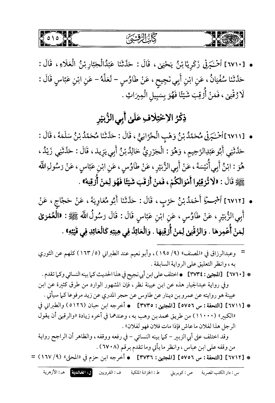 6710- أَخبَرنا زَكَرِيَّا بنُ يَحيَى، قَالَ: حَدثنا عَبدُ الجَبَّارِ بنُ العَلاءِ، قَالَ: حَدثنا سُفيانُ، عَنِ ابنِ أَبي نَجِيحٍ، عَن طَاوُوسٍ، لَعَلَّهُ عَنِ ابنِ عَبَّاسٍ، قَالَ: لا رُقْبَى، فَمَنْ أُرْقِبَ شَيْئًا فَهُوَ بِسَبِيلِ المِيرَاثِ.