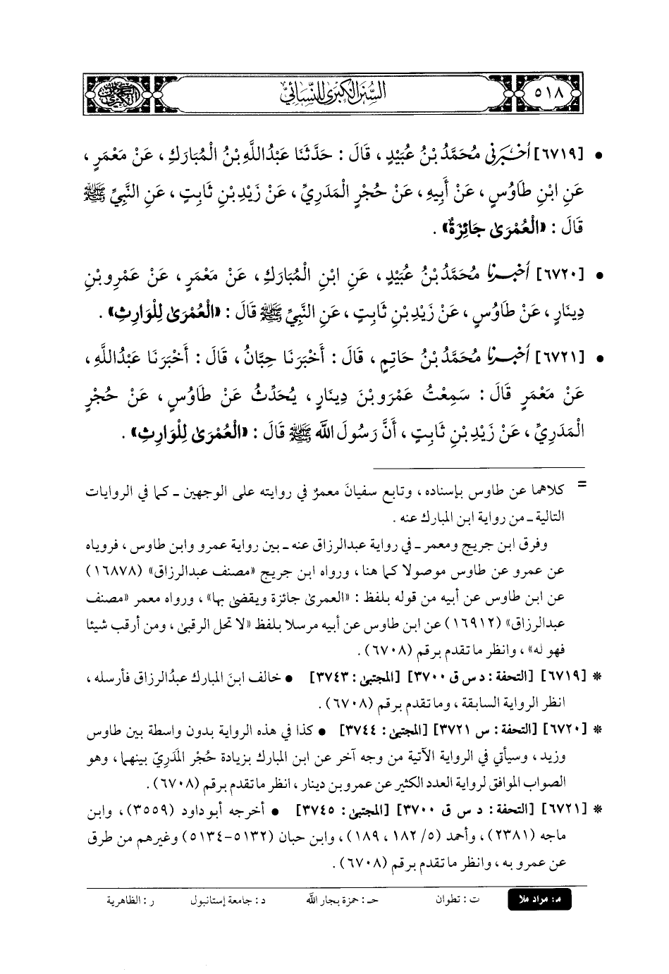 6721- أَخبَرنا مُحَمدُ بنُ حَاتِمٍ، قَالَ: أَخبَرنا حِبَّانُ، قَالَ: أَخبَرنا عَبدُ اللهِ، عَن مَعْمَرٍ، قَالَ: سَمِعْتُ عَمْرَو بْنَ دِينَارٍ يُحَدِّثُ عَن طَاوُوسٍ، عَن حُجْرٍ المَدَرِيِّ، عَن زَيْدِ بنِ ثَابِتٍ، أَنَّ رَسُولَ اللهِ صَلى الله عَليه وسَلم قَالَ: العُمْرَى لِلْوَارِثِ.