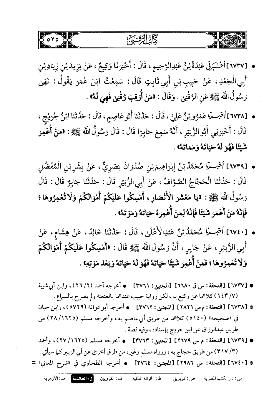 6740- أَخبَرنا مُحَمدُ بنُ عَبدِ الأَعْلَى، قَالَ: حَدثنا خَالِدٌ، عَن هِشَامٍ، عَن أَبي الزُّبَيْرِ، عَن جَابِرٍ، أَنَّ رَسُولَ اللهِ صَلى الله عَليه وسَلم قَالَ: أَمْسِكُوا عَلَيْكُمْ أَمْوَالَكُمْ، وَلا تُعْمِرُوهَا، فَمَنْ أُعْمِرَ شَيْئًا حَيَاتَهُ فَهُوَ لَهُ حَيَاتَهُ، وَبَعْدَ مَوْتِهِ.