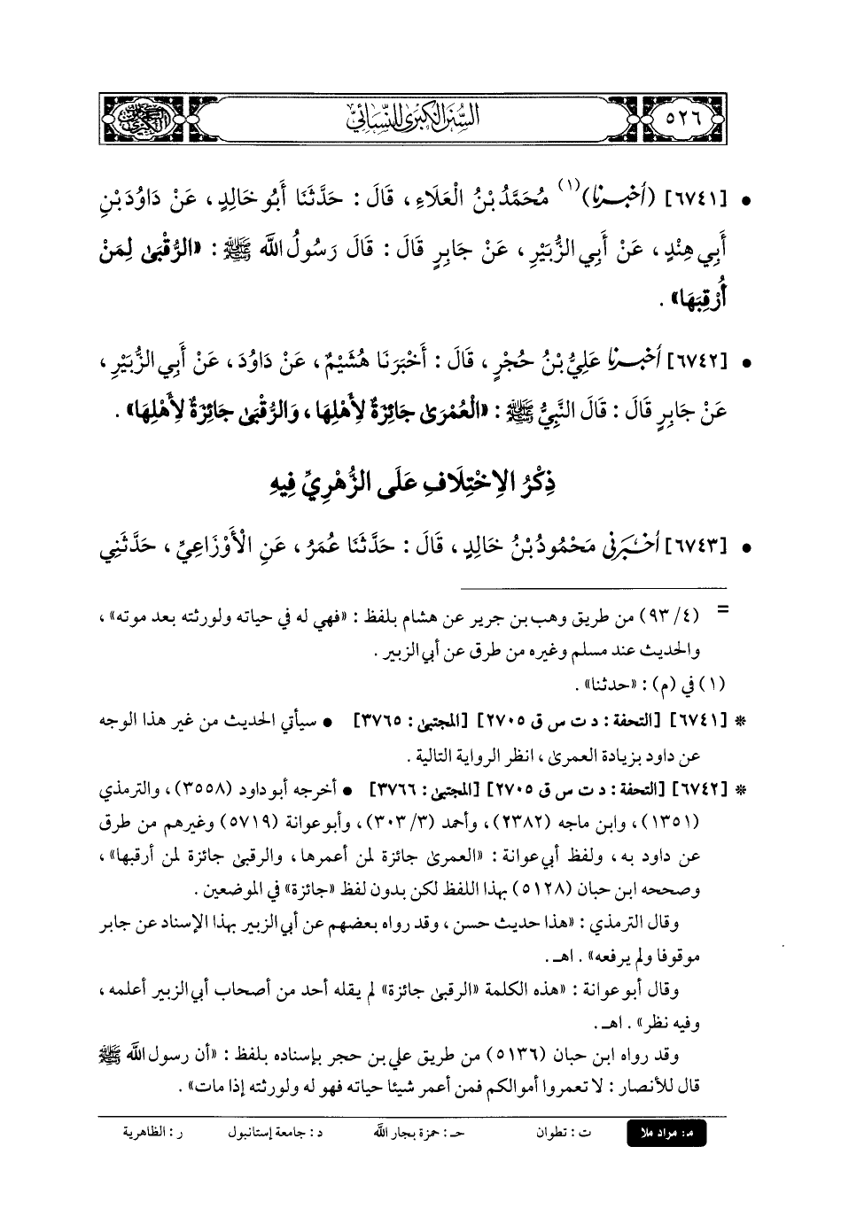 6742- أَخبَرنا عَليُّ بنُ حُجْرٍ، قَالَ: أَخبَرنا هُشَيْمٌ، عَن دَاوُدَ، عَن أَبي الزُّبَيْرِ، عَن جَابِرٍ قَالَ: قَالَ النَّبيُّ صَلى الله عَليه وسَلم: العُمْرَى جَائِزَةٌ لأَهْلِهَا، وَالرُّقْبَى جَائِزَةٌ لأَهْلِهَا.