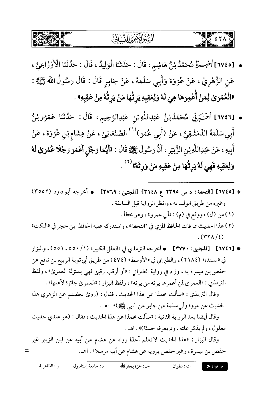 6745- أَخبَرنا مُحَمدُ بنُ هَاشِمٍ، قَالَ: حَدثنا الوَلِيدُ، قَالَ: حَدثنا الأَوْزَاعِيُّ، عَنِ الزُّهْرِيِّ، عَن عُرْوَةَ، وَأَبي سَلَمَةَ، عَن جَابِرٍ قَالَ: قَالَ رَسُولُ اللهِ صَلى الله عَليه وسَلم: العُمْرَى لِمَنْ أُعْمِرَهَا، هِيَ لَهُ وَلِعَقِبِهِ، يَرِثُهَا مَنْ يَرِثُهُ مِنْ عَقِبِهِ.