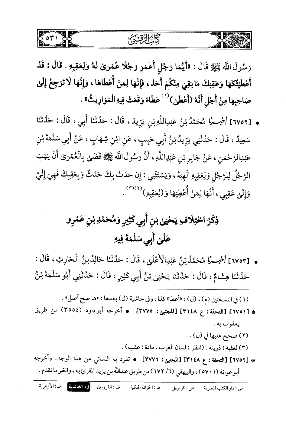 6752- أَخبَرنا مُحَمدُ بنُ عَبدِ اللهِ بنِ يَزِيدَ، قَالَ: حَدثنا أَبي، قَالَ: حَدثنا سَعِيدٌ، قَالَ: حَدَّثني يَزِيدُ بنُ أَبي حَبِيبٍ، عَنِ ابنِ شِهَابٍ، عَن أَبي سَلَمَةَ بنِ عَبدِ الرَّحمَنِ، عَن جَابِرِ بنِ عَبدِ اللهِ، أَنَّ رَسُولَ اللهِ صَلى الله عَليه وسَلم قَضَى بِالعُمْرَى أَنْ يَهَبَ الرَّجُلُ لِلرَّجُلِ وَلِعَقِبِهِ الهِبَةَ، وَيَسْتَثْنِيَ إِنْ حَدَثَ بِكَ حَدَثٌ وَبِعَقِبِكَ فَهي إِلَيَّ، وَإِلَى عَقِبِي، أنَّهَا لِمَنْ أُعْطِيَهَا وَلِعَقِبِهِ.