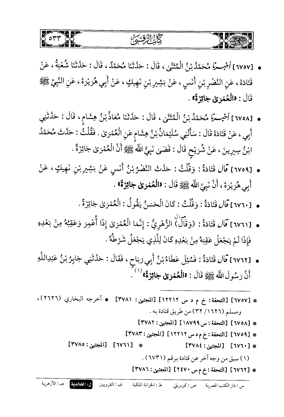 6757- أَخبَرنا مُحَمدُ بنُ المُثَنَّى، قَالَ: حَدثنا مُحَمدٌ، قَالَ: حَدثنا شُعبَةُ، عَن قَتَادَةَ، عَنِ النَّضْرِ بنِ أَنَسٍ، عَن بَشِيرِ بنِ نَهِيكٍ، عَن أَبي هُرَيرَةَ، عَنِ النَّبيِّ صَلى الله عَليه وسَلم قَالَ: العُمْرَى جَائِزَةٌ.