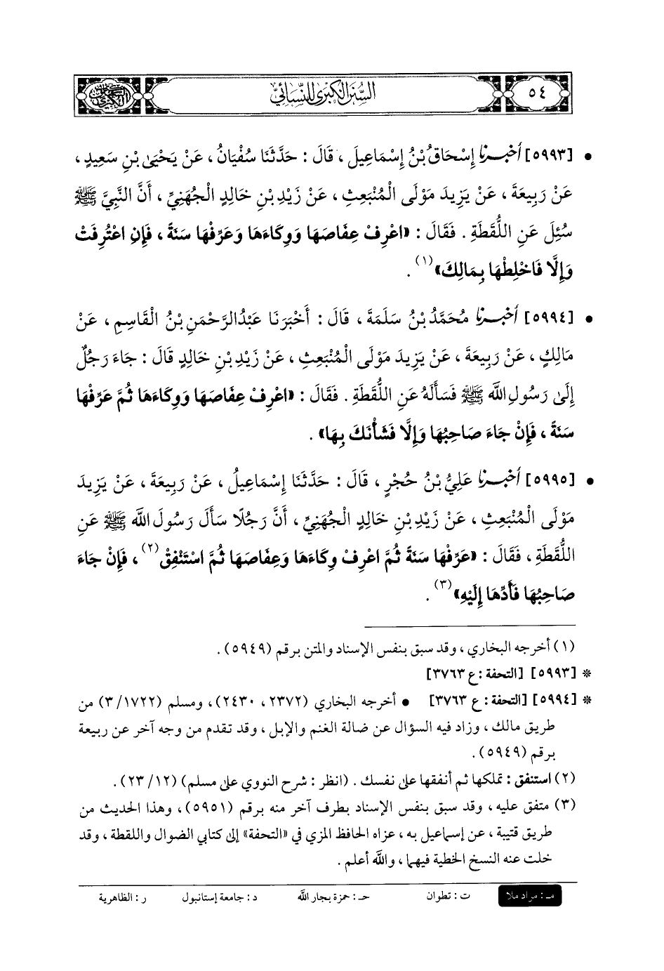 5994- أَخبَرنا مُحَمدُ بنُ سَلَمَةَ، قَالَ: أَخبَرنا عَبدُ الرَّحمَنِ بنُ القَاسِمِ، عَن مَالِكٍ، عَن رَبِيعَةَ، عَن يَزِيدَ، مَوْلَى المُنْبَعِثِ، عَن زَيْدِ بنِ خَالِدٍ، قَالَ: جَاءَ رَجُلٌ إِلَى رَسُولِ اللهِ صَلى الله عَليه وسَلم فَسَأَلَهُ عَنِ اللُّقَطَةِ، فَقَالَ: اعْرِفْ عِفَاصَهَا، وَوِكَاءَهَا، ثُمَّ عَرِّفْهَا سَنَةً، فَإِنْ جَاءَ صَاحِبُهَا، وَإِلاَّ فَشَأْنُكَ بِهَا.