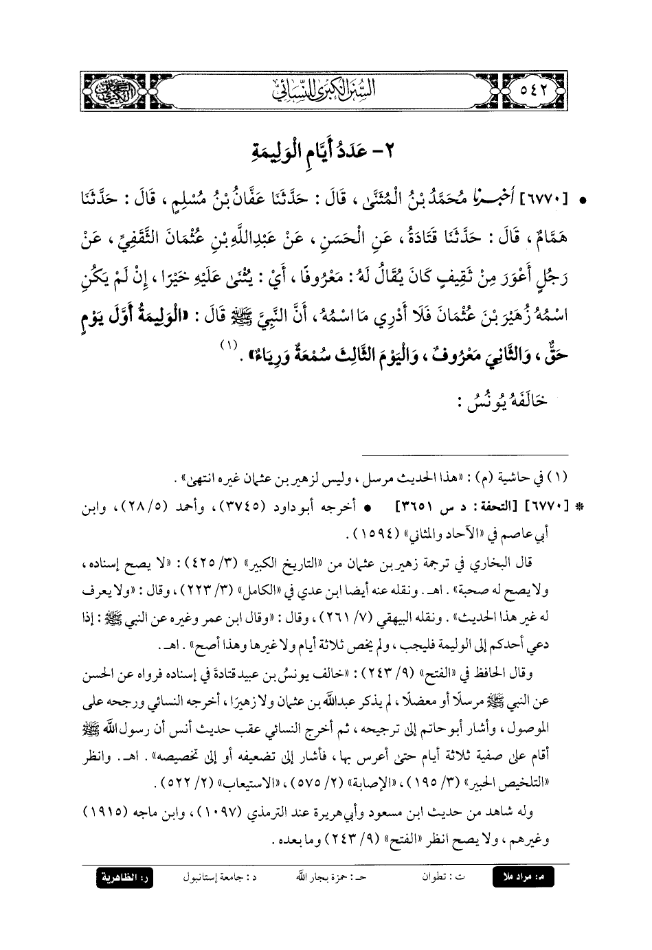 6770- أَخبَرنا مُحَمدُ بنُ المُثَنَّى، قَالَ: حَدثنا عَفَّانُ بنُ مُسْلِمٍ، قَالَ: حَدثنا هَمَّامٌ، قَالَ: حَدثنا قَتَادَةُ، عَنِ الحَسَنِ، عَن عَبدِ اللهِ بنِ عُثْمَانَ الثَّقَفِيِّ، عَن رَجُلٍ أَعْوَرَ مِنْ ثَقِيفٍ كَانَ يُقَالُ لَهُ: مَعْرُوفًا، أَيْ يُثْنَى عَلَيْهِ خَيْرًا، إِنْ لَمْ يَكُنِ اسْمُهُ زُهَيْرَ بْنَ عُثْمَانَ فَلا أَدْرِي مَا اسْمُهُ، أَنَّ النَّبيَّ صَلى الله عَليه وسَلم قَالَ: الوَلِيمَةُ أَوَّلَ يَوْمٍ حَقٌّ، وَالثَّانِيَ مَعْرُوفٌ، وَاليَوْمَ الثَّالِثَ سُمْعَةٌ وَرِيَاءٌ.