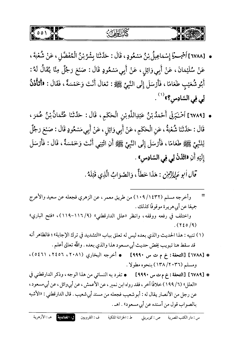 6789- أَخبَرني أَحْمَدُ بنُ عَبدِ اللهِ بنِ الحَكَمِ، قَالَ: حَدثنا عُثْمَانُ بنُ عُمَرَ، قَالَ: حَدثنا شُعبَةُ، عَنِ الحَكَمِ، عَن أَبي وَائِلٍ، عَن أَبي مَسْعُودٍ، قَالَ: صَنَعَ رَجُلٌ لِلنَّبِيِّ صَلى الله عَليه وسَلم طَعَامًا، فَأَرْسَلَ إِلَى النَّبيِّ صَلى الله عَليه وسَلم: أَنِ ائْتِنِي أَنْتَ وَخَمْسَةٌ، قَالَ: فَأَرْسَلَ إِلَيْهِ: أَنِ ائْذَنْ لِي فِي السَّادِسِ.