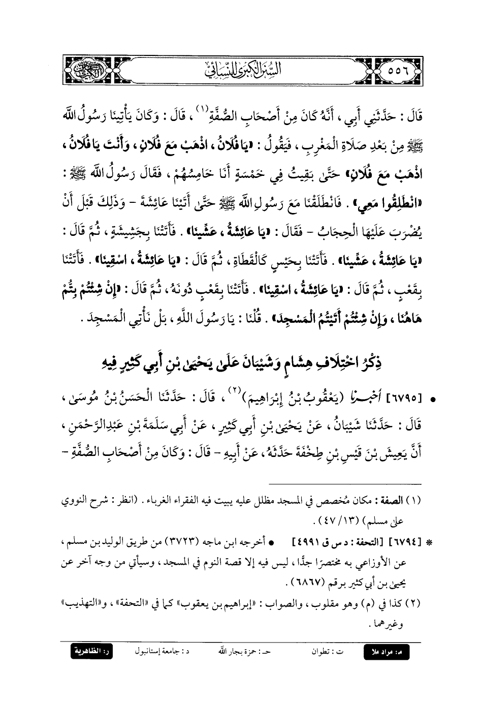 6795- أَخبَرنا إِبرَاهِيمُ بنُ يَعْقُوبَ (1)، قَالَ: حَدثنا الحَسَنُ بنُ مُوسَى، قَالَ: حَدثنا شَيْبَانُ، عَن يَحيَى بنِ أَبي كَثِيرٍ، عَن أَبي سَلَمَةَ بنِ عَبدِ الرَّحمَنِ، أَنَّ يَعِيشَ بْنَ قَيْسِ بنِ طِخْفَةَ حَدَّثَهُ، عَن أبيه قَالَ: وَكَانَ مِنْ أَصْحَابِ الصُّفَّةِ، قَالَ: قَالَ رَسُولُ اللهِ صَلى الله عَليه وسَلم: يَا فُلانُ، اذْهَبْ بِهَذَا مَعَكَ، يَا فُلانُ، اذْهَبْ بِهَذَا مَعَكَ، بَقِيتُ رَابِعُ أَرْبَعَةٍ، فَقَالَ لَنَا رَسُولُ اللهِ صَلى الله عَليه وسَلم: انْطَلِقُوا، فَانْطَلَقْنَا حَتَّى أَتَيْنَا بَيْتَ عَائِشَةَ، فَقَالَ رَسُولُ اللهِ صَلى الله عَليه وسَلم لِعَائِشَةَ: أَطْعِمِينَا، فَجَاءَتْ بِجَشِيشَةٍ، فَأَكَلْنَا، ثُمَّ قَالَ: يَا عَائِشَةُ، أَطْعِمِينَا، فَجَاءَتْ بِحَيْسٍ مِثْلِ القَطَاةِ، ثُمَّ قَالَ: يَا عَائِشَةُ، اسْقِينَا، فَجَاءَتْ بِعُسٍّ (2) فَشَرِبْنَا، ثُمَّ قَالَ: يَا عَائِشَةُ، اسْقِينَا، فَجَاءَتْ بِقَدَحٍ صَغِيرٍ فِيهِ لَبَنٌ، فَقَالَ لَنَا رَسُولُ اللهِ صَلى الله عَليه وسَلم: إِنْ شِئْتُمْ بِتُّمْ هَاهُنَا، وَإِنْ شِئْتُمُ انْطَلِقُوا إِلَى المَسْجِدِ، قُلْنَا: بَلْ نَنْطَلِقُ إِلَى المَسْجِدِ.