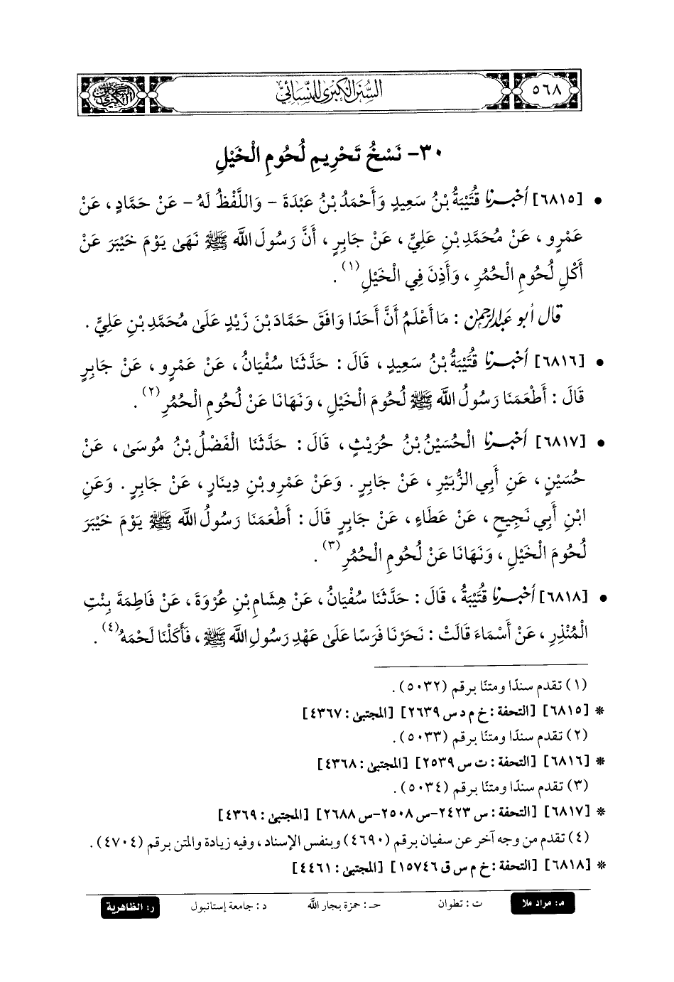 6817- أَخبَرنا الحُسَيْنُ بنُ حُرَيْثٍ، قَالَ: حَدثنا الفَضْلُ بنُ مُوسَى، عَن حُسَيْنٍ، عَن أَبي الزُّبَيْرِ، عَن جَابِرٍ، وَعَن عَمْرِو بنِ دِينَارٍ، عَن جَابِرٍ، وَعَنِ ابنِ أَبي نَجِيحٍ، عَن عَطَاءٍ، عَن جَابِرٍ، قَالَ: أَطْعَمَنَا رَسُولُ اللهِ صَلى الله عَليه وسَلم يَوْمَ خَيْبَرَ لُحُومَ الخَيْلِ، وَنَهَانَا عَن لُحُومِ الحُمُرِ.