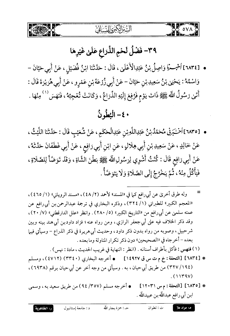 6834- أَخبَرنا وَاصِلُ بنُ عَبدِ الأَعْلَى، قَالَ: حَدثنا ابنُ فُضَيْلٍ، عَن أَبي حَيَّانَ، وَاسْمُهُ: يَحيَى بنُ سَعِيدِ بنِ حَيَّانَ، عَن أَبي زُرْعَةَ بنِ عَمْرٍو، عَن أَبي هُرَيرَةَ قَالَ: أُتِيَ رَسُولُ اللهِ صَلى الله عَليه وسَلم ذَاتَ يَوْمٍ، فَرُفِعَ إِلَيْهِ الذِّرَاعَ، وَكَانَتْ تُعْجِبُهُ، فَنَهَسَ مِنْهَا.