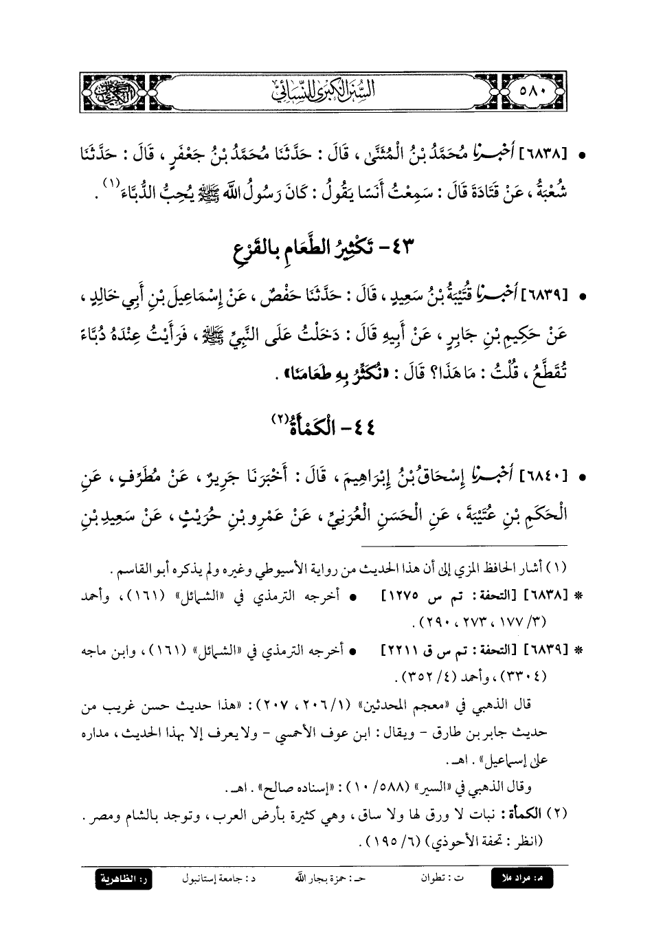 6839- أَخبَرنا قُتَيبَةُ بنُ سَعِيدٍ، قَالَ: حَدثنا حَفْصٌ، عَن إِسمَاعِيلَ بنِ أَبي خَالِدٍ، عَن حَكِيمِ بنِ جَابِرٍ، عَن أَبيهِ، قَالَ: دَخَلْتُ عَلَى النَّبيِّ صَلى الله عَليه وسَلم، فَرَأَيْتُ عِنْدَهُ دُبَّاءً تُقْطَعُ، قُلْتُ: مَا هَذَا؟ قَالَ: نُكَثِّرُ بِهِ طَعَامَنَا.