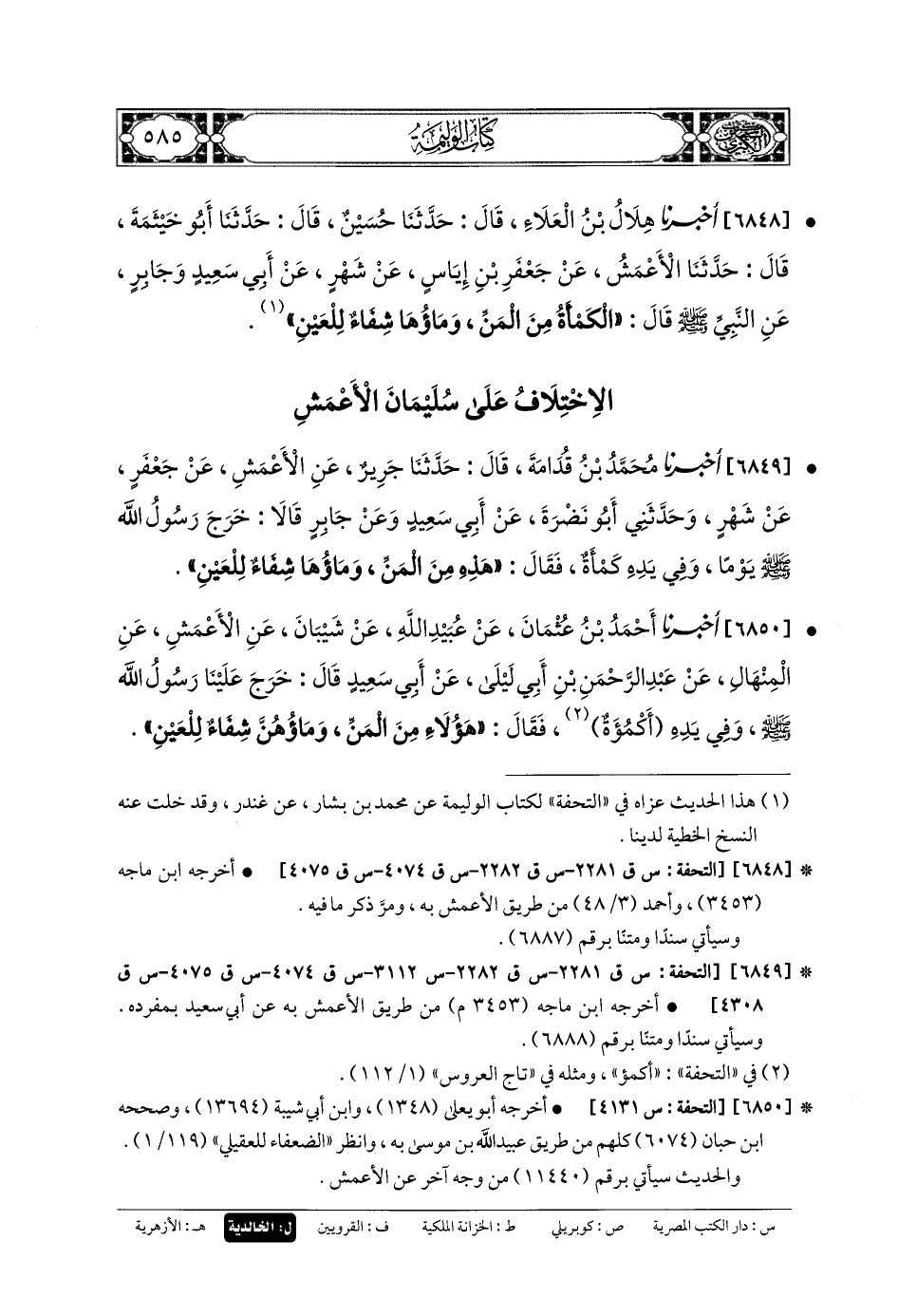 6850- أَخبَرنا أَحْمَدُ بنُ عُثْمَانَ، عَن عُبَيدِ اللهِ، عَن شَيْبَانَ، عَنِ الأَعْمَشِ، عَنِ المِنْهَالِ، عَن عَبدِ الرَّحمَنِ بنِ أَبي لَيْلَى، عَن أَبي سَعِيدٍ، قَالَ: خَرَجَ عَلَيْنَا رَسُولُ اللهِ صَلى الله عَليه وسَلم وَفِي يَدِهِ أَكْمُؤَةٌ، فَقَالَ: هَؤُلاءِ مِنَ المَنِّ، وَمَاؤُهُنَّ شِفَاءٌ لِلْعَيْنِ.