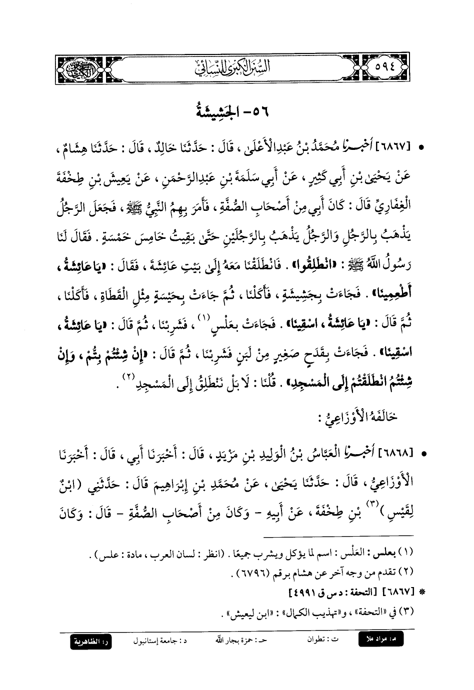 6867- أَخبَرنا مُحَمدُ بنُ عَبدِ الأَعْلَى، قَالَ: حَدثنا خَالِدٌ، قَالَ: حَدثنا هِشَامٌ، عَن يَحيَى بنِ أَبي كَثِيرٍ، عَن أَبي سَلَمَةَ بنِ عَبدِ الرَّحمَنِ (1)، عَن يَعِيشَ بنِ طِخْفَةَ الغِفَارِيِّ، قَالَ: كَانَ أَبي مِنْ أَصْحَابِ الصُّفَّةِ، فَأَمَرَ بِهِمُ النَّبيُّ صَلى الله عَليه وسَلم، فَجَعَلَ الرَّجُلُ يَذْهَبُ بِالرَّجُلِ، وَالرَّجُلُ يَذْهَبُ بِالرَّجُلَيْنِ، حَتَّى بَقِيتُ خَامِسَ خَمْسَةٍ، فَقَالَ لَنَا رَسُولُ اللهِ صَلى الله عَليه وسَلم: انْطَلِقُوا، فَانْطَلَقْنَا مَعَهُ إِلَى بَيْتِ عَائِشَةَ، فَقَالَ: يَا عَائِشَةُ، أَطْعِمِينَا، فَجَاءَتْ بِجَشِيشَةٍ (2)، فَأَكَلْنَا، ثُمَّ جَاءَتْ بِحَيْسَةٍ مِثْلِ القَطَاةِ، فَأَكَلْنَا، ثُمَّ قَالَ: يَا عَائِشَةُ، اسْقِينَا، فَجَاءَتْ بِعُسٍّ (3)، فَشَرِبْنَا، ثُمَّ قَالَ: يَا عَائِشَةُ، اسْقِينَا، فَجَاءَتْ بِقَدَحٍ صَغِيرٍ مِنْ لَبَنٍ، فَشَرِبْنَا، ثُمَّ قَالَ: إِنْ شِئْتُمْ بِتُّمْ، وَإِنْ شِئْتُمُ انْطَلَقْتُمْ إِلَى المَسْجِدِ، قُلْنَا: لا، بَلْ نَنْطَلِقُ إِلَى المَسْجِدِ.