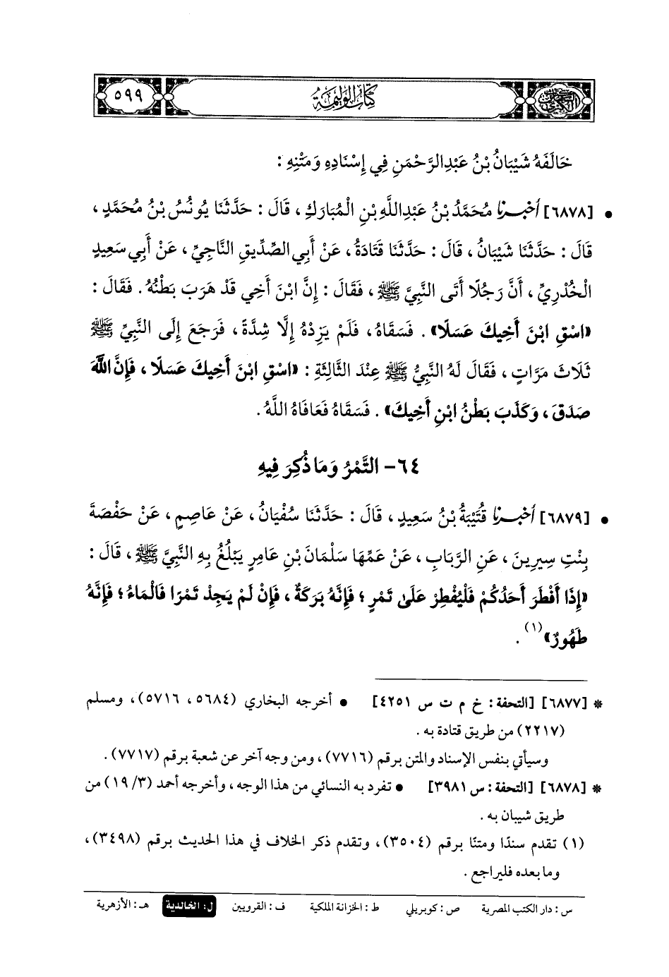 6879- أَخبَرنا قُتَيبَةُ بنُ سَعِيدٍ، قَالَ: حَدثنا سُفيانُ، عَن عَاصِمٍ، عَن حَفْصَةَ بِنْتِ سِيرِينَ، عَنِ الرَّبَابِ، عَن عَمِّهَا سَلْمَانَ بنِ عَامِرٍ يَبْلُغُ بِهِ النَّبيَّ صَلى الله عَليه وسَلم، قَالَ: إِذَا أَفْطَرَ أَحَدُكُمْ فَلْيُفْطِرْ عَلَى تَمْرٍ، فَإِنَّهُ بَرَكَةٌ، فَإِنْ لَمْ يَجِدْ تَمْرًا فَالمَاءَ، فَإِنَّهُ طَهُوَرٌ.