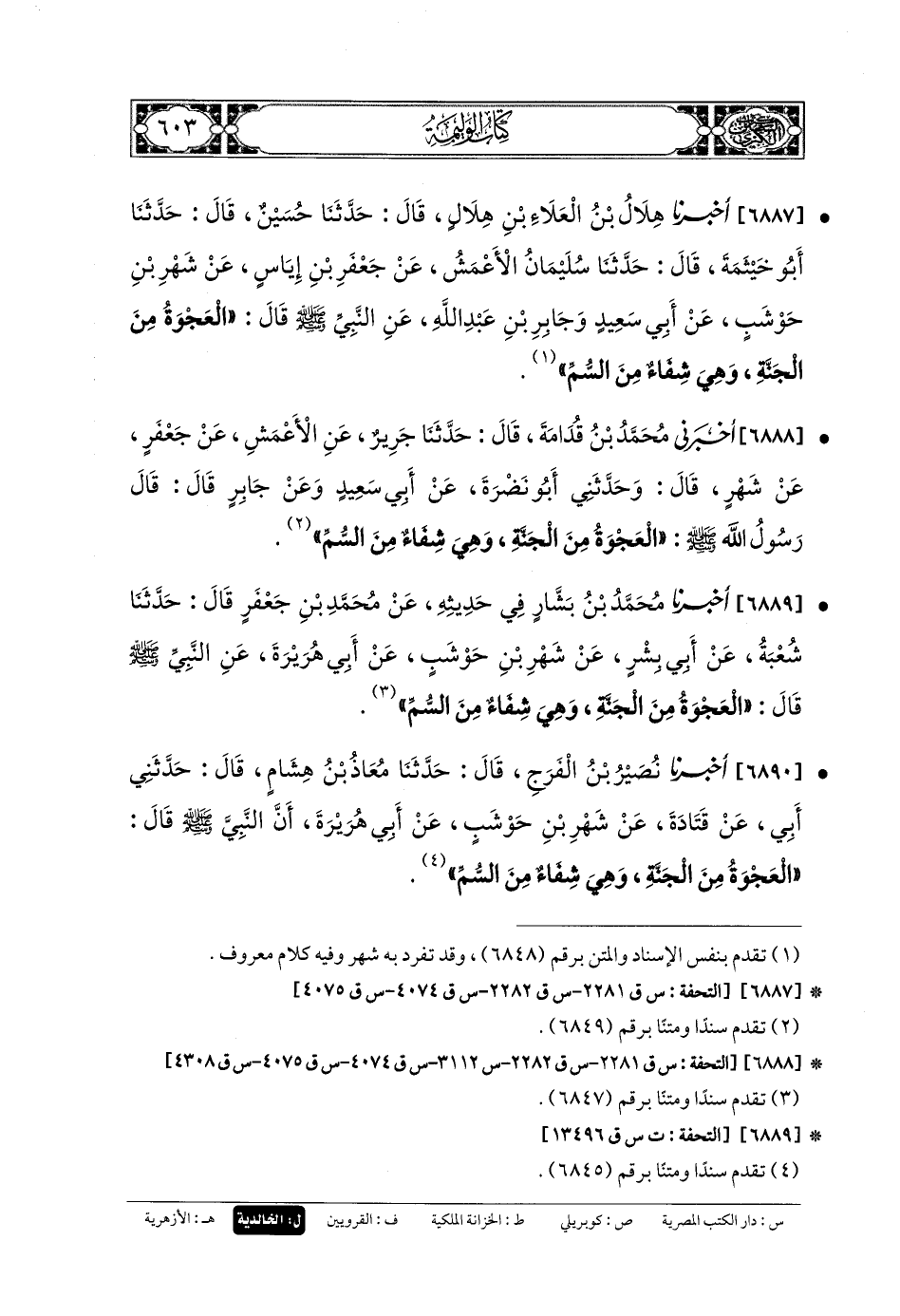 6890- أَخبَرنا نُصَيْرُ بنُ الفَرَجِ، قَالَ: حَدثنا مُعَاذُ بنُ هِشَامٍ، قَالَ: حَدَّثني أَبي، عَن قَتَادَةَ، عَن شَهْرِ بنِ حَوْشَبٍ، عَن أَبي هُرَيرَةَ، أَنَّ النَّبيَّ صَلى الله عَليه وسَلم قَالَ: العَجْوَةُ مِنَ الجَنَّةِ، وَهِيَ شِفَاءٌ مِنَ السُّمِّ.