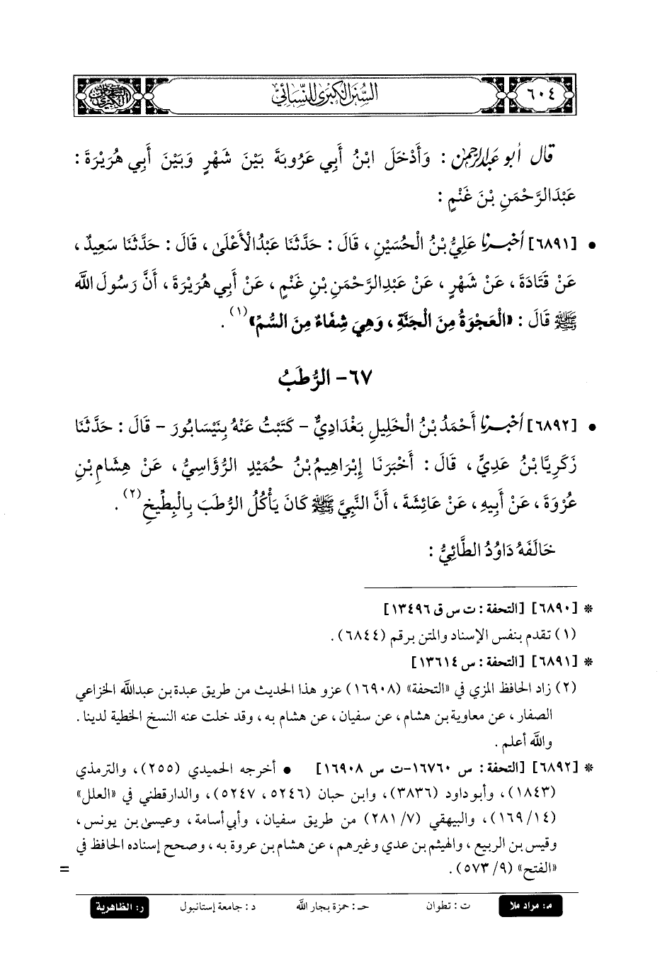 6892- أَخبَرنا أَحْمَدُ بنُ الخَلِيلِ، بَغْدَادِيٌّ، كَتَبْتُ عَنهُ بِنَيْسَابُورَ، قَالَ: حَدثنا زَكَرِيَّا بنُ عَدِيٍّ، قَالَ: أَخبَرنا إِبرَاهِيمُ بنُ حُمَيْدٍ الرُّؤَاسِيُّ، عَن هِشَامِ بنِ عُرْوَةَ، عَن أَبيهِ، عَن عَائِشَةَ، أَنَّ النَّبيَّ صَلى الله عَليه وسَلم كَانَ يَأْكُلُ الرُّطَبَ بِالبِطِّيخِ.