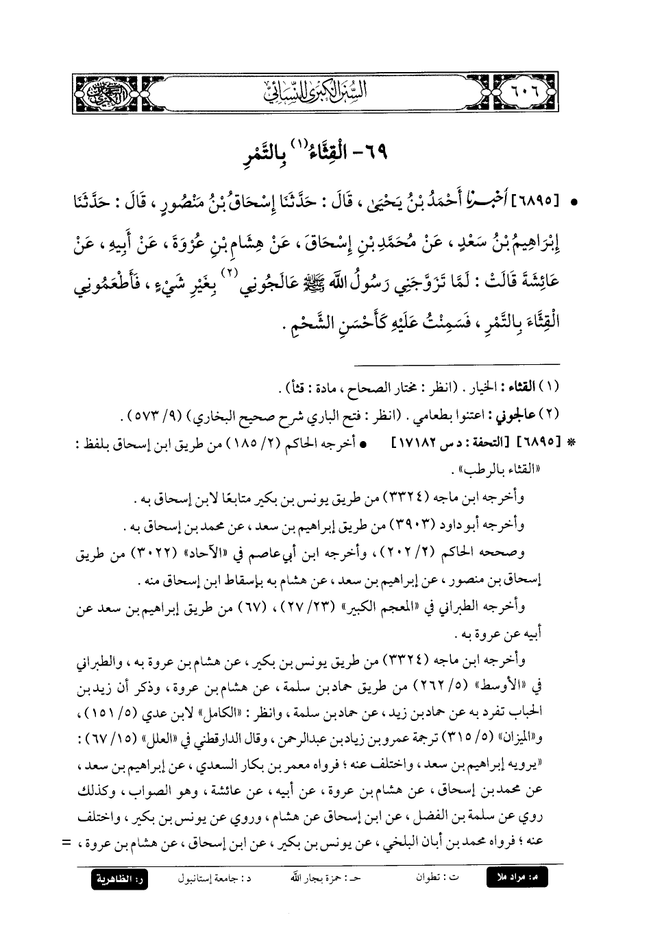 6895- أَخبَرنا أَحْمَدُ بنُ يَحيَى، قَالَ: حَدثنا إِسحَاقُ بنُ مَنصُورٍ، قَالَ: حَدثنا إِبرَاهِيمُ بنُ سَعْدٍ، عَن مُحَمدِ بنِ إِسحَاقَ، عَن هِشَامِ بنِ عُرْوَةَ، عَن أَبيهِ، عَن عَائِشَةَ قَالَتْ: لَمَّا تَزَوَّجَنِي رَسُولُ اللهِ صَلى الله عَليه وسَلم عَالَجُونِي بِغَيْرِ شَيْءٍ، فَأَطْعَمُونِي القِثَّاءَ بِالتَّمْرِ، فَسَمِنْتُ عَلَيْهِ كَأَحْسَنِ الشَّحْمِ.