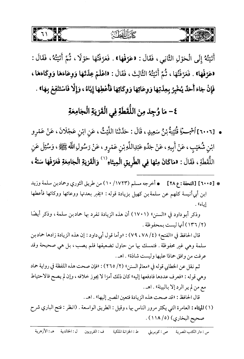6006- أَخبَرنا قُتَيبَةُ بنُ سَعِيدٍ، قَالَ: حَدثنا اللَّيْثُ، عَنِ ابنِ عَجْلانَ، عَن عَمْرِو بنِ شُعَيْبٍ، عَن أَبيهِ، عَن جَدِّهِ عَبدِ اللهِ بنِ عَمْرٍو، عَن رَسُولِ اللهِ صَلى الله عَليه وسَلم، وَسُئِلَ عَنِ اللُّقَطَةِ، فَقَالَ: مَا كَانَ مِنْهَا فِي الطَّرِيقِ المِيتَاءِ، وَالقَرْيَةِ الجَامِعَةِ، فَعَرِّفْهَا سَنَةً، فَإِنْ جَاءَ صَاحِبُهَا، فَادْفَعْهَا إِلَيْهِ، وَإِنْ لَمْ يَأْتِ فَهِيَ لَكَ، وَمَا كَانَ فِي الخَرِبِ فَفِيهَا، وَفِي الرِّكَازِ الخُمُسُ.