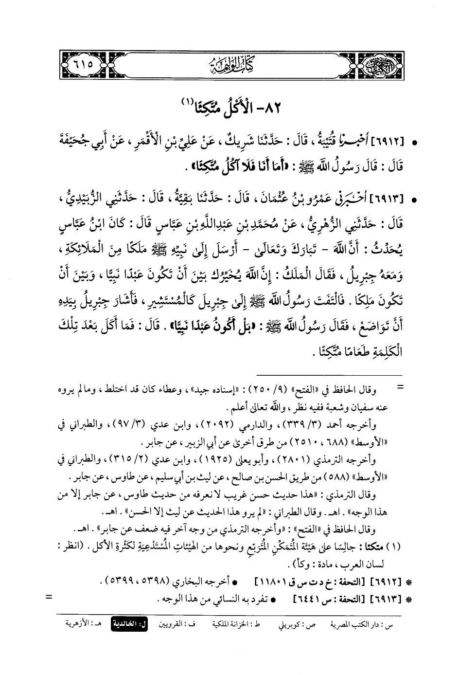 6913- أَخبَرني عَمْرُو بنُ عُثْمَانَ، قَالَ: حَدثنا بَقِيَّةُ، قَالَ: حَدَّثني الزُّبَيْدِيُّ، قَالَ: حَدَّثني الزُّهْرِيُّ، عَن مُحَمدِ بنِ عَبدِ اللهِ بنِ عَبَّاسٍ، قَالَ: كَانَ ابنُ عَبَّاسٍ يُحَدِّثُ أَنَّ اللهَ تَبَارَكَ وَتَعَالَى أَرْسَلَ إِلَى نَبِيِّهِ صَلى الله عَليه وسَلم مَلَكًا مِنَ المَلائِكَةِ وَمَعَهُ جِبْرِيلُ، فَقَالَ المَلَكُ: إِنَّ اللهَ يُخَيِّرُكَ بَيْنَ أَنْ تَكُونَ عَبدًا نَبِيًّا، وَبَيْنَ أَنْ تَكُونَ مَلِكًا، فَالتَفَتَ رَسُولُ اللهِ صَلى الله عَليه وسَلم إِلَى جِبْرِيلَ كَالمُسْتَشِيرِ، فَأَشَارَ جِبْرِيلُ بِيَدِهِ أَنْ تَوَاضَعَ، فَقَالِ رَسُولُ اللهِ صَلى الله عَليه وسَلم: بَلْ أَكُونُ عَبدًا نَبِيًّا، قَالَ: فَمَا أَكَلَ بَعْدَ تِلْكَ الكَلِمَةِ طَعَامًا مُتَّكِئًا.