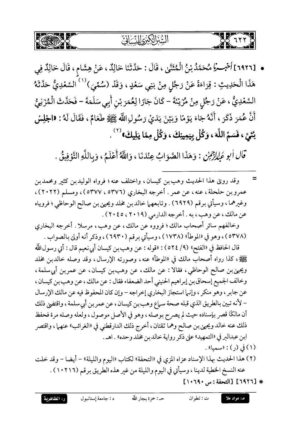 6926- أَخبَرنا مُحَمدُ بنُ المُثَنَّى، قَالَ: حَدثنا خَالِدٌ، عَن هِشَامٍ، قَالَ خَالِدٌ فِي هَذَا الحَدِيثِ: قِرَاءَةً عَن رَجُلٍ مِنْ بَنِي سَعْدٍ، وَقَدْ سُمَّي السَّعْدِيَّ، حَدَّثَهُ السَّعْدِيُّ، عَن رَجُلٍ مِنْ مُزَيْنَةَ كَانَ جَارًا لِعُمَرَ بنِ أَبي سَلَمَةَ، فَحَدَّثَ المُزَنِيُّ أَنَّ عُمَرَ ذَكَرَ أَنَّهُ جَاءَ يَوْمًا، وَبَيْنَ يَدَيْ رَسُولِ اللهِ صَلى الله عَليه وسَلم طَعَامٌ، فَقَالَ لَهُ: اجْلِسْ بُنَيَّ، فَسَمِّ اللهَ، وَكُلْ بِيَمِينِكَ، وَكُلْ مِمَّا يَلِيكَ.