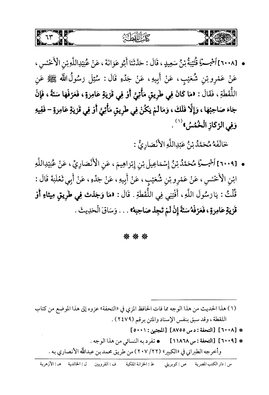 6009- أَخبَرنا مُحَمدُ بنُ إِسمَاعِيلَ بنِ إِبرَاهِيمَ، عَنِ الأَنْصَارِيِّ، عَن عُبَيدِ اللهِ بنِ الأَخْنَسِ، عَن عَمْرِو بنِ شُعَيْبٍ، عَن أَبيهِ، عَن جَدِّهِ، عَن أَبي ثَعْلَبَةَ، قَالَ: قُلْتُ: يَا رَسُولَ اللهِ، أَفْتِنِي فِي اللُّقَطَةِ، قَالَ: مَا وَجَدْتَ فِي طَرِيقٍ مَيْتَاءٍ أَوْ قَرْيَةٍ عَامِرَةٍ، فَعَرِّفْهُ سَنَةً، إِنْ لَمْ تَجِدْ صَاحِبَهُ ... وَسَاقَ الحَدِيثَ.