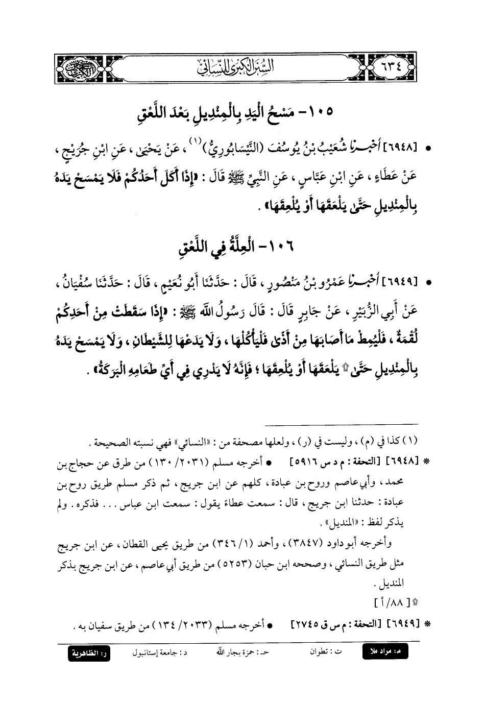 6948- أَخبَرنا شُعَيْبُ بنُ يُوسُفَ النَّيْسَابُورِيُّ، عَن يَحيَى، عَنِ ابنِ جُرَيْجٍ، عَن عَطَاءٍ، عَنِ ابنِ عَبَّاسٍ، عَنِ النَّبيِّ صَلى الله عَليه وسَلم قَالَ: إِذَا أَكَلَ أَحَدُكُمْ فَلا يَمْسَحْ يَدَهُ بِالمِنْدِيلِ حَتَّى يَلْعَقَهَا أَوْ يُلْعِقَهَا.