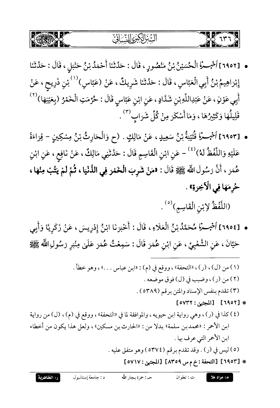 6953- أَخبَرنا قُتَيبَةُ بنُ سَعِيدٍ، عَن مَالِكٍ، وَالحَارِثِ بنِ مِسْكِينٍ، قِرَاءَةً عَلَيْهِ، وَاللَّفْظُ لَهُ، عَنِ ابنِ القَاسِمِ، عَن مَالِكٍ، عَن نَافِعٍ، عَنِ ابنِ عُمَرَ، أَنَّ رَسُولَ اللهِ صَلى الله عَليه وسَلم قَالَ: مَنْ شَرِبَ الخَمْرَ فِي الدُّنْيَا، ثُمَّ لَمْ يَتُبْ مِنْهَا، حُرِمَهَا فِي الآخِرَةِ.