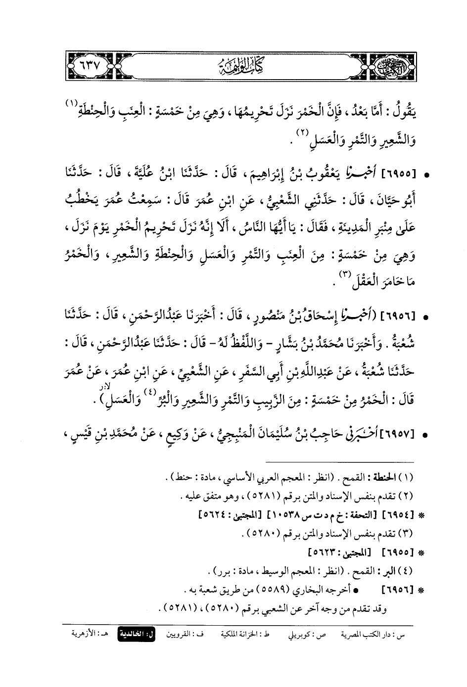 6957- أَخبَرني حَاجِبُ بنُ سُلَيمَانَ المَنْبِجِيُّ، عَن وَكِيعٍ، عَن مُحَمدِ بنِ قَيسٍ، عَنِ الشَّعْبِيِّ، عَنِ ابنِ عُمَرَ، عَن عُمَرَ، قَالَ: الخَمْرُ مِنْ خَمْسٍ: مِنَ التَّمْرِ، وَالزَّبِيبِ، وَالحِنْطَةِ، وَالشَّعِيرِ، وَالعَسَلِ.