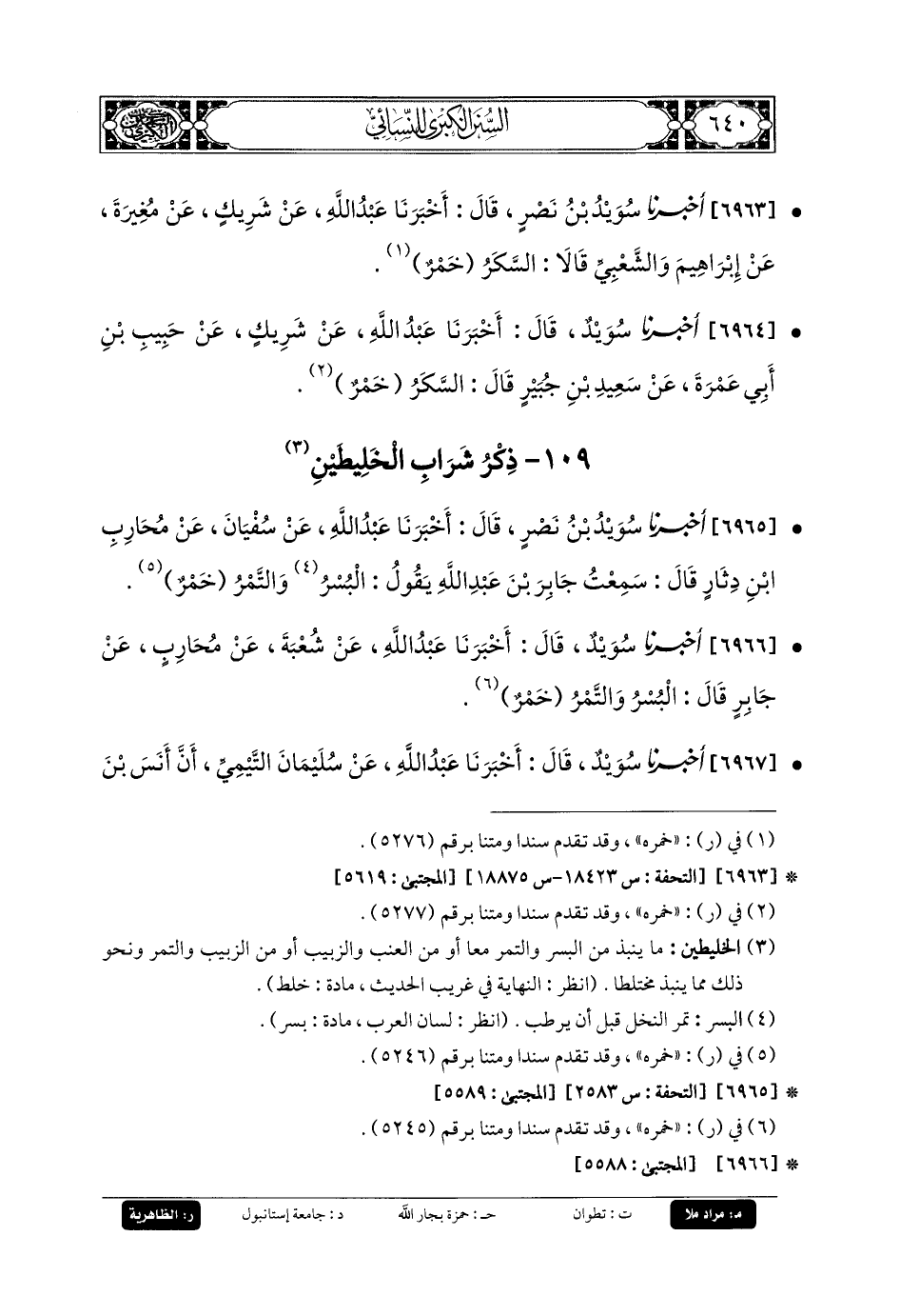 6965- أَخبَرنا سُوَيْدُ بنُ نَصْرٍ، قَالَ: أَخبَرنا عَبدُ اللهِ، عَن سُفيانَ، عَن مُحَارِبِ بنِ دِثَارٍ، قَالَ: سَمِعْتُ جَابِرَ بْنَ عَبدِ اللهِ، يَقُولُ: البُسْرُ وَالتَّمْرُ خَمْرٌ.