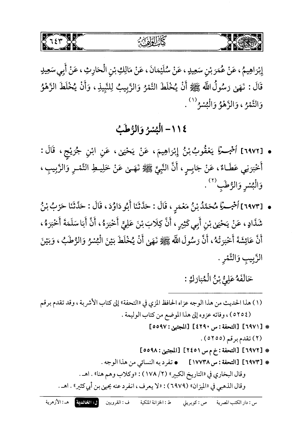 6972- أَخبَرنا يَعْقُوبُ بنُ إِبرَاهِيمَ، عَن يَحيَى، عَنِ ابنِ جُرَيْجٍ، قَالَ: أَخبَرني عَطَاءٌ، عَن جَابِرٍ، أَنَّ النَّبيَّ صَلى الله عَليه وسَلم نَهَى عَن خَلِيطِ التَّمْرِ وَالزَّبِيبِ، وَالبُسْرِ وَالرُّطَبِ.