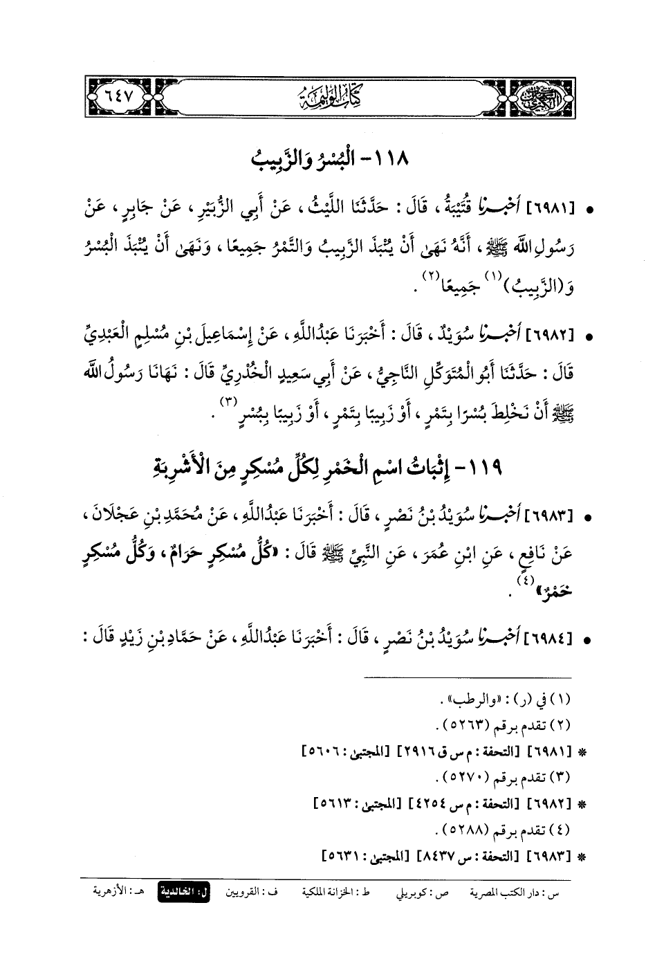 6984- أَخبَرنا سُوَيْدُ بنُ نَصْرٍ، قَالَ: أَخبَرنا عَبدُ اللهِ، عَن حَمَّادِ بنِ زَيْدٍ، قَالَ: حَدثنا أَيوبُ، عَن نَافِعٍ، عَنِ ابنِ عُمَرَ، عَنِ النَّبيِّ صَلى الله عَليه وسَلم قَالَ: كُلُّ مُسْكِرٍ حَرَامٌ، وَكُلُّ مُسْكِرٍ خَمْرٌ.
