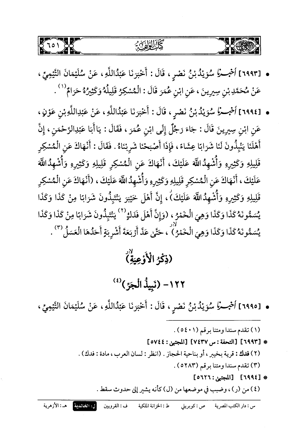 6994- أَخبَرنا سُوَيْدُ بنُ نَصْرٍ، قَالَ: أَخبَرنا عَبدُ اللهِ، عَن عَبدِ اللهِ بنِ عَوْنٍ، عَنِ ابنِ سِيرِينَ، قَالَ: جَاءَ رَجُلٌ إِلَى ابنِ عُمَرَ، فَقَالَ: يَا أَبَا عَبدِ الرَّحمَنِ، إِنَّ أَهْلَنَا يَنْبِذُونَ لَنَا شَرَابًا عِشَاءً، فَإِذَا أَصْبَحْنَا شَرِبْنَاهُ، فَقَالَ: أَنْهَاكَ عَنِ المُسْكِرِ قَلِيلِهِ وَكَثِيرِهِ، وَأُشْهِدُ اللهَ عَلَيْكَ، أَنْهَاكَ عَنِ المُسْكِرِ قَلِيلِهِ وَكَثِيرِهِ، وَأُشْهِدُ اللهَ عَلَيْكَ، أَنْهَاكَ عَنِ المُسْكِرِ قَلِيلِهِ وَكَثِيرِهِ، وَأُشْهِدُ اللهَ عَلَيْكَ، أَنْهَاكَ عَنِ المُسْكِرِ قَلِيلِهِ وَكَثِيرِهِ، وَأُشْهِدُ اللهَ عَلَيْكَ، إِنَّ أَهْلَ خَيْبَرَ يَنْتَبِذُونَ شَرَابًا مِنْ كَذَا وَكَذَا، يُسَمُّونَهُ كَذَا وَكَذَا، وَهِيَ الخَمْرُ، وَإِنَّ أَهْلَ فَدَكَ يَنْتَبِذُونَ شَرَابًا مِنْ كَذَا وَكَذَا، يُسَمُّونَهُ كَذَا وَكَذَا، وَهِيَ الخَمْرُ، حَتَّى عَدَّ أَرْبَعَةَ أَشْرِبَةٍ، أَحَدُهَا العَسَلُ.