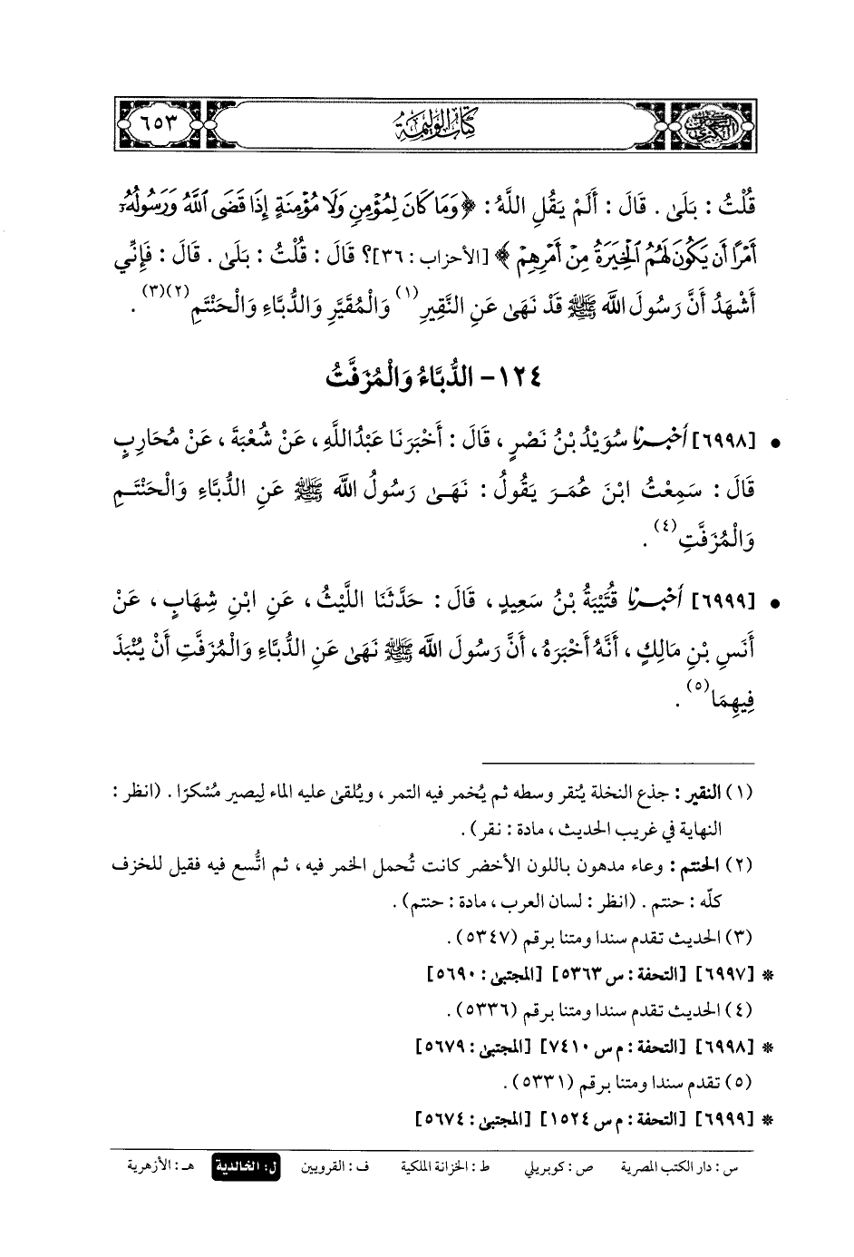 6999- أَخبَرنا قُتَيبَةُ بنُ سَعِيدٍ، قَالَ: حَدثنا اللَّيْثُ، عَنِ ابنِ شِهَابٍ، عَن أَنَسِ بنِ مَالِكٍ، أَنَّهُ أَخْبَرَهُ، أَنَّ رَسُولَ اللهِ صَلى الله عَليه وسَلم نَهَى عَنِ الدُّبَّاءِ، وَالمُزَفَّتِ أَنْ يُنْبَذَ فِيهِمَا.