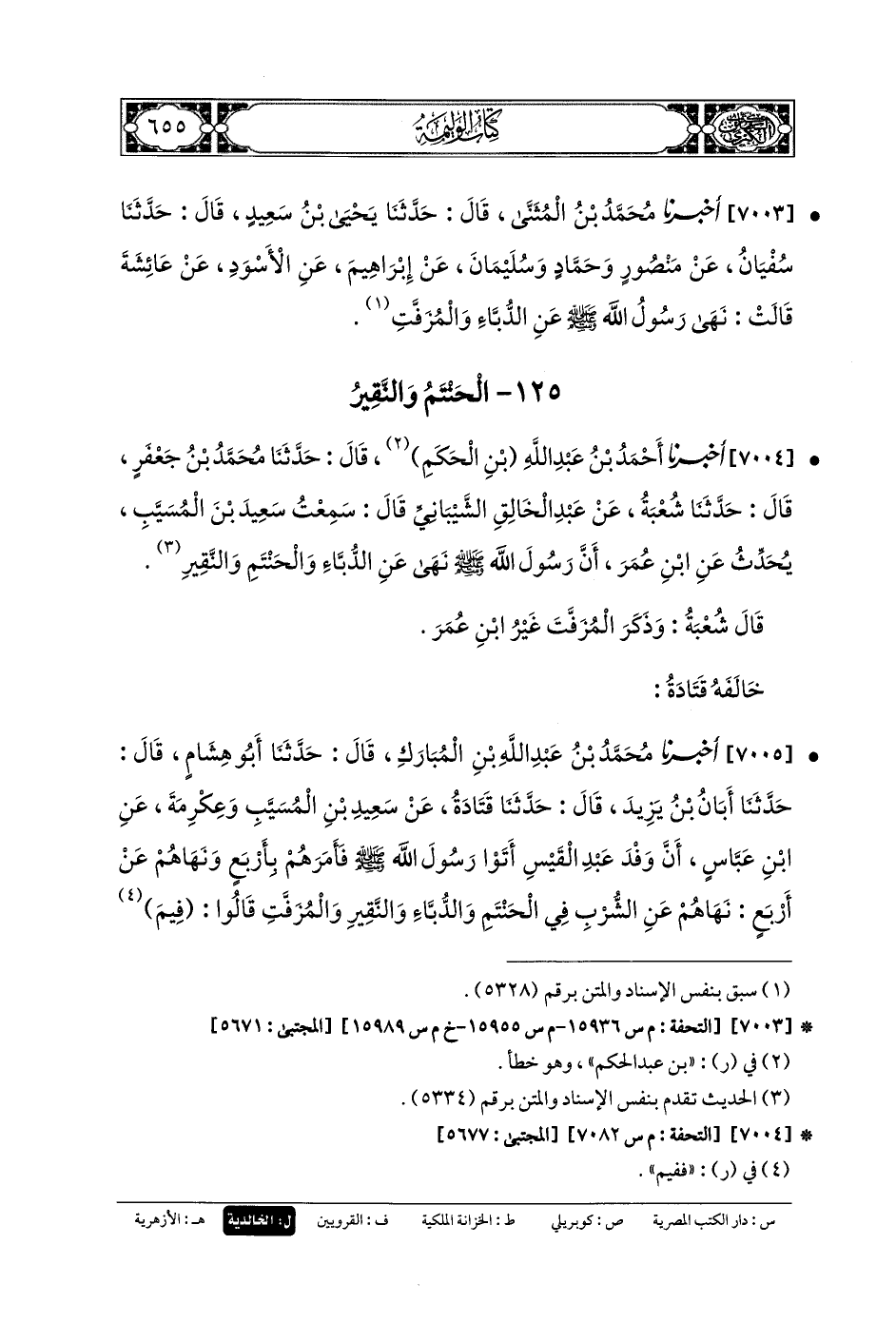 7004- أَخبَرنا أَحْمَدُ بنُ عَبدِ اللهِ بنِ الحَكَمِ، قَالَ: حَدثنا مُحَمدُ بنُ جَعفَرٍ، قَالَ: حَدثنا شُعبَةُ، عَن عَبدِ الخَالِقِ الشَّيْبَانِيِّ، قَالَ: سَمِعْتُ سَعِيدَ بْنَ المُسَيَّبِ يُحَدِّثُ عَنِ ابنِ عُمَرَ، أَنَّ رَسُولَ اللهِ صَلى الله عَليه وسَلم نَهَى عَنِ الدُّبَّاءِ، وَالحَنْتَمِ، وَالنَّقِيرِ.