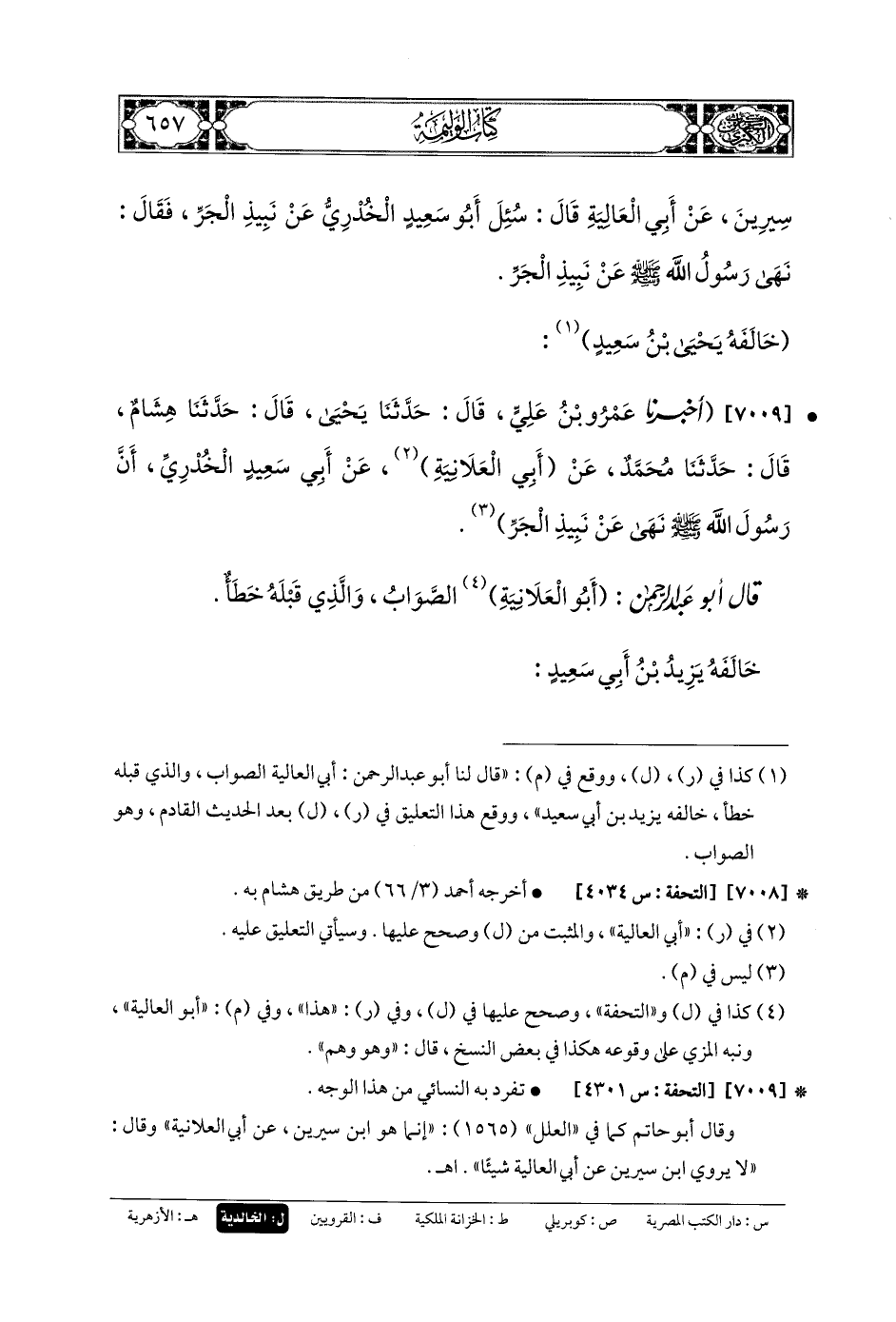 7009- أَخبَرنا عَمْرُو بنُ عَليٍّ، قَالَ: حَدثنا يَحيَى، قَالَ: حَدثنا هِشَامٌ، قَالَ: حَدثنا مُحَمدٌ، عَن أَبي العَلانِيَةِ، عَن أَبي سَعِيدٍ الخُدْرِيِّ، أَنَّ رَسُولَ اللهِ صلى الله عليه وسلم نَهَى عَن نَبِيذِ الجَرِّ.