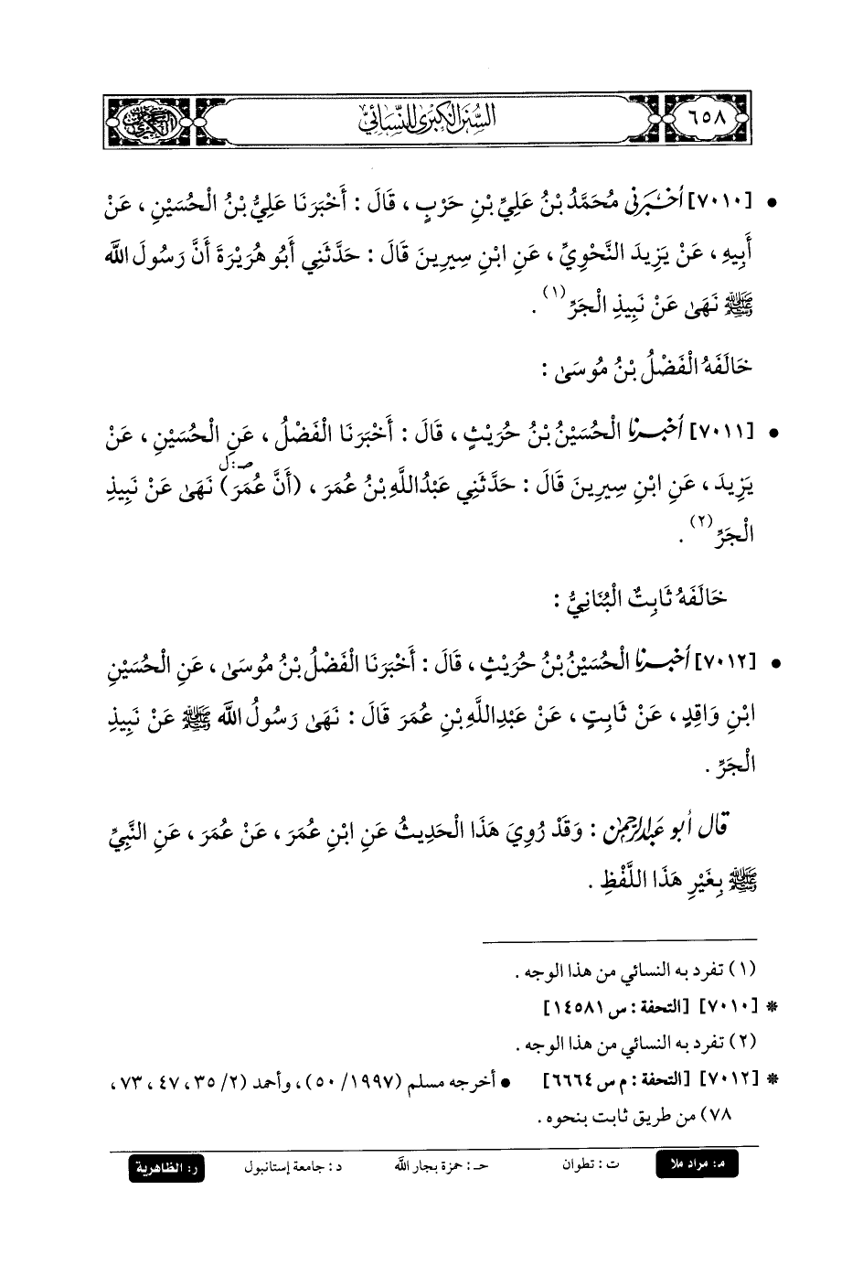 7010- أَخبَرني مُحَمدُ بنُ عَليِّ بنِ حَرْبٍ، قَالَ: أَخبَرنا عَليُّ بنُ الحُسَيْنِ، عَن أَبيهِ، عَن يَزِيدَ النَّحْوِيِّ، عَنِ ابنِ سِيرِينَ، قَالَ: حَدَّثني أَبو هُرَيرَةَ، أَنَّ رَسُولَ اللهِ صَلى الله عَليه وسَلم نَهَى عَن نَبِيذِ الجَرِّ.