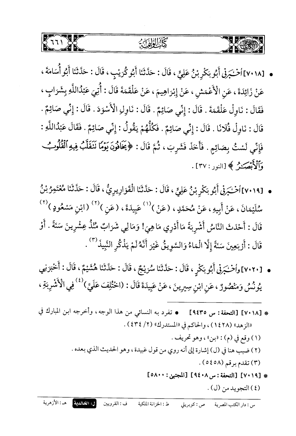 7018- أَخبَرني أَبو بَكْرِ بنُ عَليٍّ، قَالَ: حَدثنا أَبو كُرَيْبٍ، قَالَ: حَدثنا أَبو أُسَامَةَ، عَن زَائِدَةَ، عَنِ الأَعْمَشِ، عَن إِبرَاهِيمَ، عَن عَلْقَمَةَ، قَالَ: أُتِيَ عَبدُ اللهِ بِشَرَابٍ فَقَالَ: نَاوِلْ عَلْقَمَةَ، قَالَ: إِنِّي صَائِمٌ، قَالَ: نَاوِلِ الأَسْوَدَ، قَالَ: إِنِّي صَائِمٌ، قَالَ: نَاوِلْ فُلانًا، قَالَ: إِنِّي صَائِمٌ، فَكُلُّهُمْ يَقُولُ: إِنِّي صَائِمٌ، فَقَالَ عَبدُ اللهِ: فَإِنِّي لَسْتُ بِصَائِمٍ، فَأَخَذَ فَشَرِبَ، ثُمَّ قَالَ: {يَخَافُونَ يَوْمًا تَتَقَلَّبُ فِيهِ القُلُوبُ وَالأَبْصَارُ}.