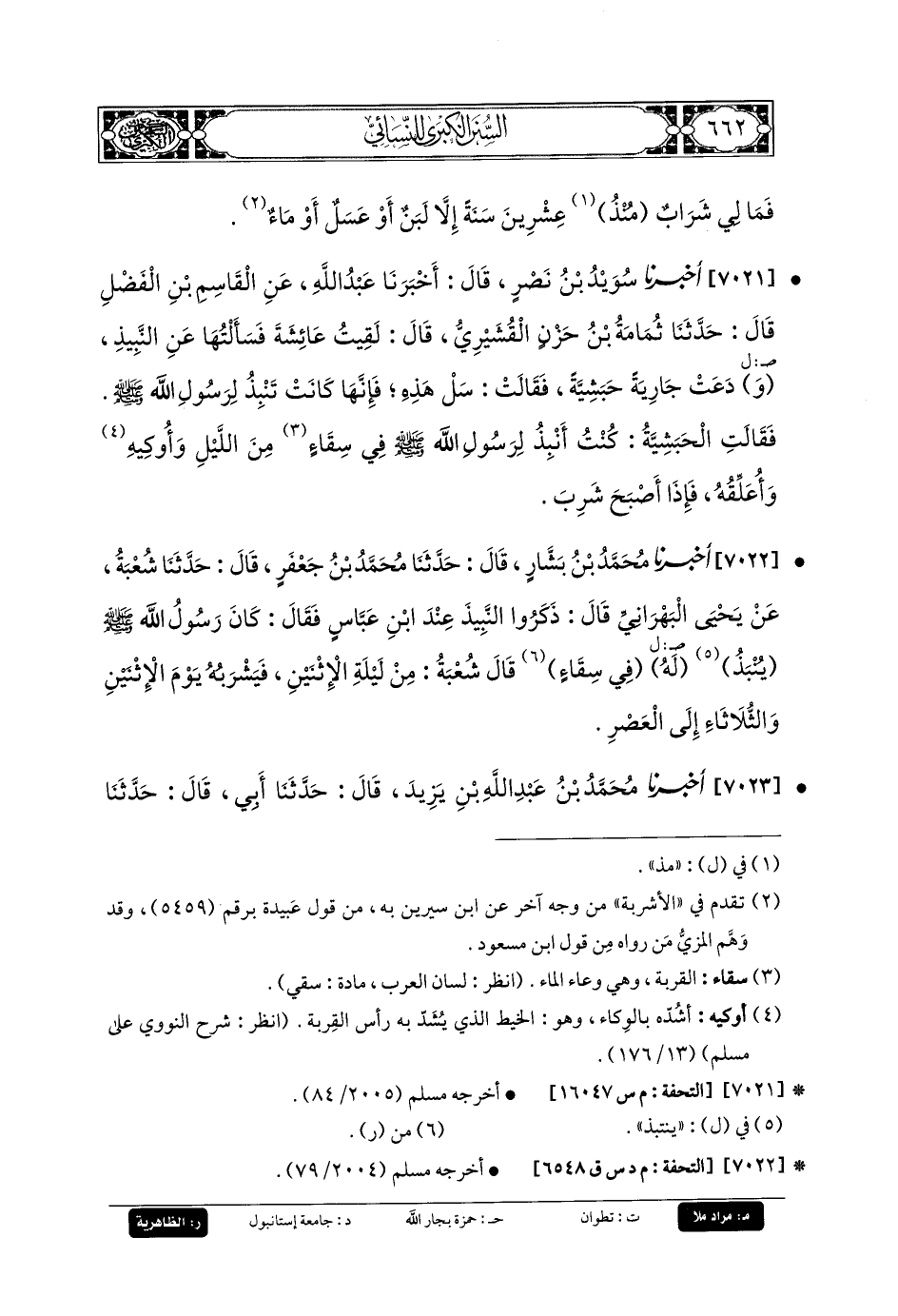7021- أَخبَرنا سُوَيْدُ بنُ نَصْرٍ، قَالَ: أَخبَرنا عَبدُ اللهِ، عَنِ القَاسِمِ بنِ الفَضْلِ، قَالَ: حَدثنا ثُمَامَةُ بنُ حَزْنٍ القُشَيْرِيُّ، قَالَ: لَقِيتُ عَائِشَةَ فَسَأَلْتُهَا عَنِ النَّبيذِ، وَدَعَتْ جَارِيَةً حَبَشِيَّةً، فَقَالَتْ: سَلْ هَذِهِ، فَإِنَّهَا كَانَتْ تَنْبِذُ لِرَسُولِ اللهِ صَلى الله عَليه وسَلم، فَقَالَتِ الحَبَشِيَّةُ: كُنْتُ أَنْبِذُ لِرَسُولِ اللهِ صَلى الله عَليه وسَلم فِي سِقَاءٍ مِنَ اللَّيْلِ وَأُوكِيهِ وَأُعَلِّقُهُ، فَإِذَا أَصْبَحَ شَرِبَ.