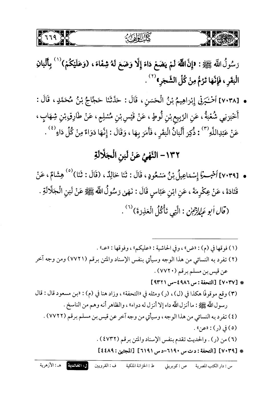 7038- أَخبَرني إِبرَاهِيمُ بنُ الحَسَنِ، قَالَ: حَدثنا حَجَّاجٌ بن محمد، قَالَ: أَخبَرني شُعبَةُ، عَنِ الرَّبِيعِ بنِ لُوطٍ، عَن قَيْسِ بنِ مُسْلِمٍ، عَن طَارِقِ بنِ شِهَابٍ، عَن عَبدِ اللهِ، ذُكِرَ أَلْبَانَ البَقَرِ (1)، فَأَمَرَ بِهَا، وَقَالَ: إِنَّهَا دَوَاءٌ مِنْ كُلِّ دَاءٍ.