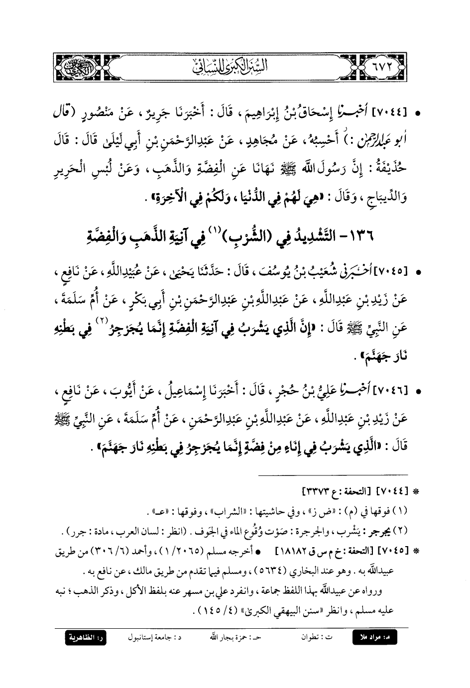 7045- أَخبَرني شُعَيْبُ بنُ يُوسُفَ، قَالَ: حَدثنا يَحيَى، عَن عُبَيدِ اللهِ، عَن نَافِعٍ، عَن زَيْدِ بنِ عَبدِ اللهِ، عَن عَبدِ اللهِ بنِ عَبدِ الرَّحمَنِ بنِ أَبي بَكْرٍ، عَن أُمِّ سَلَمَةَ، عَنِ النَّبيِّ صَلى الله عَليه وسَلم: قَالَ: إِنَّ الَّذِي يَشْرَبُ فِي آنِيَةِ الفِضَّةِ إِنَّمَا يُجَرْجِرُ فِي بَطْنِهِ نَارَ جَهَنَّمَ.