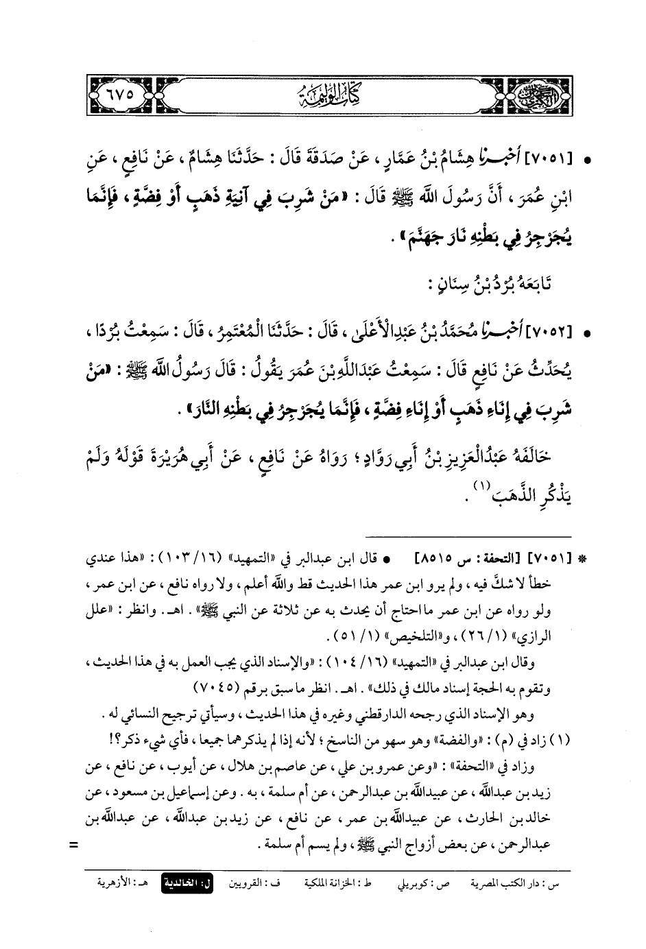 7051- أَخبَرنا هِشَامُ بنُ عَمَّارٍ، عَن صَدَقَةَ، قَالَ: حَدثنا هِشَامٌ، عَن نَافِعٍ، عَنِ ابنِ عُمَرَ، أَنَّ رَسُولَ اللهِ صَلى الله عَليه وسَلم قَالَ: مَنْ شَرِبَ فِي آنِيَةِ ذَهَبٍ أَوْ فِضَّةٍ، فَإِنَّمَا يُجَرْجِرُ فِي بَطْنِهِ نَارَ جَهَنَّمَ.