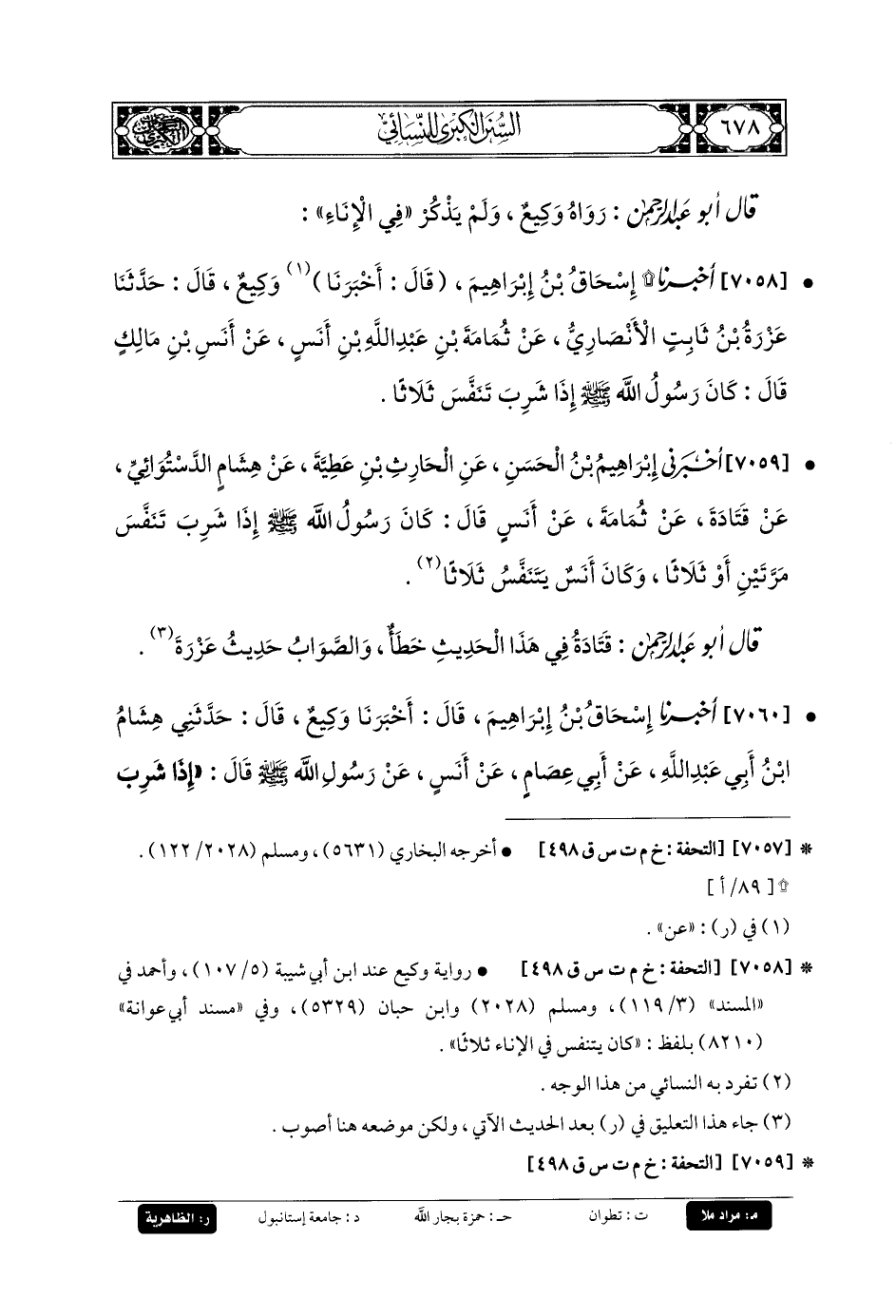 7058- أَخبَرنا إِسحَاقُ بنُ إِبرَاهِيمَ، قَالَ: أَخبَرنا وَكِيعٌ، قَالَ: حَدثنا عَزْرَةُ بنُ ثَابِتٍ الأَنْصَارِيُّ، عَن ثُمَامَةَ بنِ عَبدِ اللهِ بنِ أَنَسٍ، عَن أَنَسِ بنِ مَالِكٍ، قَالَ: كَانَ رَسُولُ اللهِ صَلى الله عَليه وسَلم إِذَا شَرِبَ تَنَفَّسَ ثَلاثًا.
