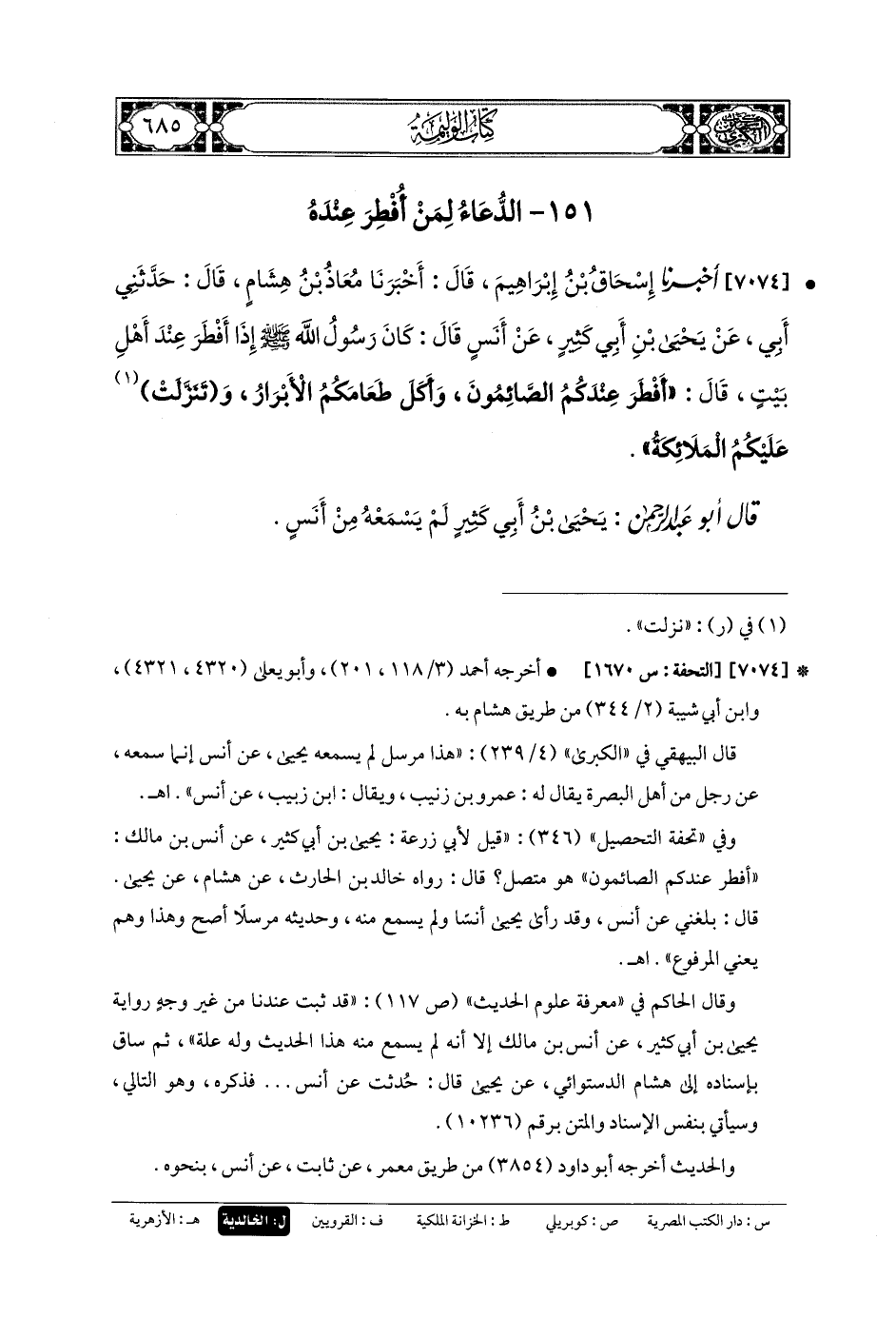 7074- أَخبَرنا إِسحَاقُ بنُ إِبرَاهِيمَ، قَالَ: أَخبَرنا مُعَاذُ بنُ هِشَامٍ، قَالَ: حَدَّثني أَبي، عَن يَحيَى بنِ أَبي كَثِيرٍ، عَن أَنَسٍ، قَالَ: كَانَ رَسُولُ اللهِ صَلى الله عَليه وسَلم إِذَا أَفْطَرَ عِنْدَ أَهْلِ بَيْتٍ قَالَ: أَفْطَرَ عِنْدَكُمُ الصَّائِمُونَ، وَأَكَلَ طَعَامَكُمُ الأَبْرَارُ، وَتَنَزَّلَتْ عَلَيْكُمُ المَلائِكَةُ.