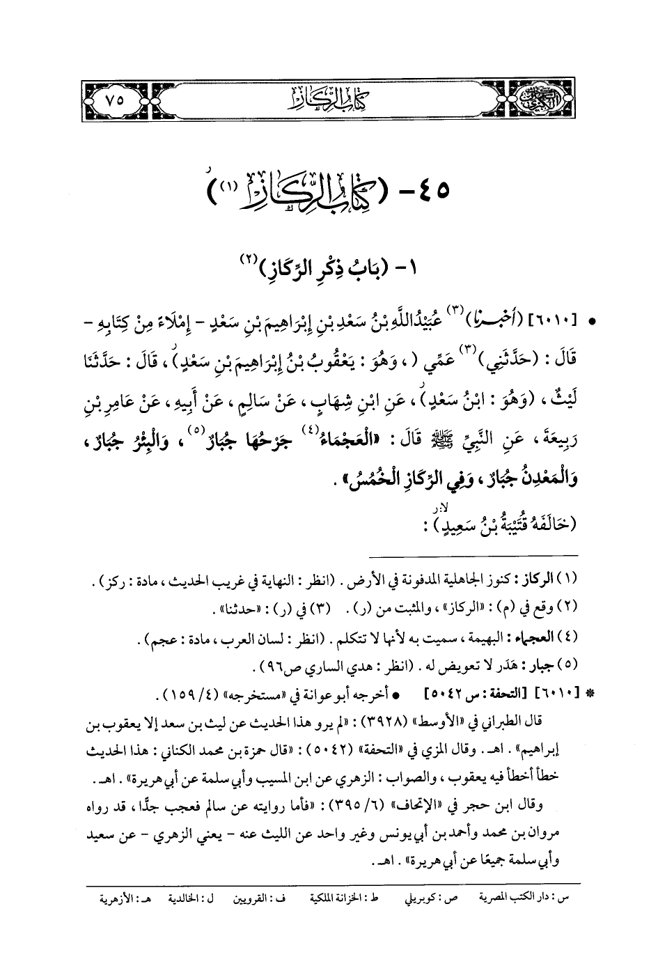 6010 - أَخبَرنا عُبَيدُ اللهِ بنُ سَعْدِ بنِ إِبرَاهِيمَ بنِ سَعْدٍ إِمْلاءً مِنْ كِتَابِهِ، قَالَ: حَدَّثني عَمِّي، وَهُوَ يَعْقُوبُ بنُ إِبرَاهِيمَ بنِ سَعْدٍ، قَالَ: حَدثنا لَيْثٌ، وَهُوَ ابنُ سَعْدٍ، عَنِ ابنِ شِهَابٍ، عَن سَالِمٍ، عَن أَبيهِ، عَن عَامِرِ بنِ رَبِيعَةَ، عَنِ النَّبيِّ صَلى الله عَليه وسَلم، قَالَ: العَجْمَاءُ جَرْحُهَا جُبَارٌ، وَالبِئْرُ جُبَارٌ، وَالمَعْدِنُ جُبَارٌ، وَفِي الرِّكَازِ الخُمُسُ.