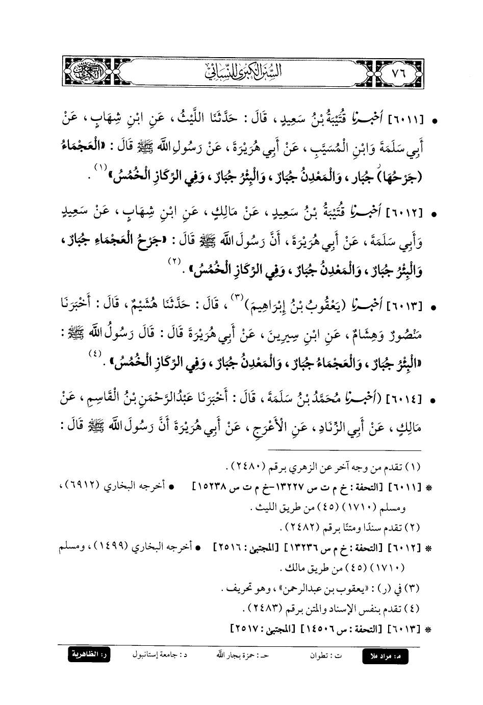 6011- أَخبَرنا قُتَيبَةُ بنُ سَعِيدٍ، قَالَ: حَدثنا اللَّيْثُ، عَنِ ابنِ شِهَابٍ، عَن أَبي سَلَمَةَ، وَابْنُ المُسَيَّبِ، عَن أَبي هُرَيرَةَ، عَن رَسُولِ اللهِ صَلى الله عَليه وسَلم قَالَ: العَجْمَاءُ جَرْحُهَا جُبَارٌ، وَالمَعْدِنُ جُبَارٌ، وَالبِئْرُ جُبَارٌ، وَفِي الرِّكَازِ الخُمُسُ.