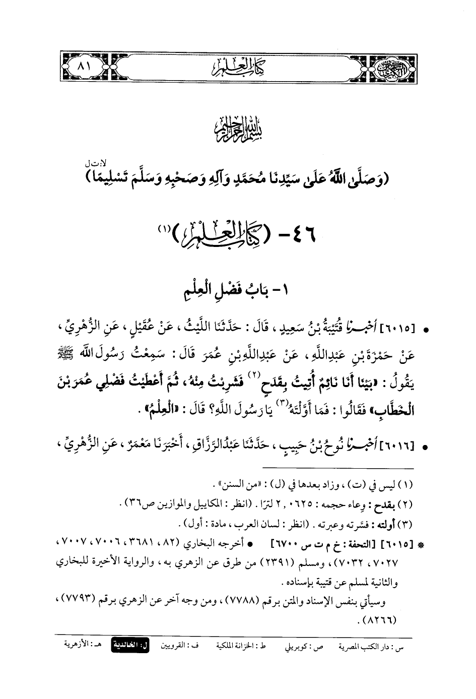 6016- أَخبَرنا نُوحُ بنُ حَبِيبٍ، قَالَ حَدثنا عَبدُ الرَّزَّاقِ، قال أَخبَرنا مَعْمَرٌ، عَنِ الزُّهْرِيِّ، عَن سَالِمٍ، عَن أَبيهِ، كَانَ النَّبيُّ صَلى الله عَليه وسَلم يُحَدِّثُ قَالَ: بَيْنَا أَنَا نَائِمٌ رَأَيْتُ أَنِّي أُتِيتُ بِقَدَحٍ، فَشَرِبْتُ مِنْهُ، حَتَّى إِنِّي أَرَى الرِّيَّ يَجْرِي، ثُمَّ إِنِّي أَعْطَيْتُ فَضْلِي عُمَرَ، قَالُوا: فَمَا أَوَّلْتَ يَا رَسُولَ اللهِ؟ قَالَ: العِلْمُ.