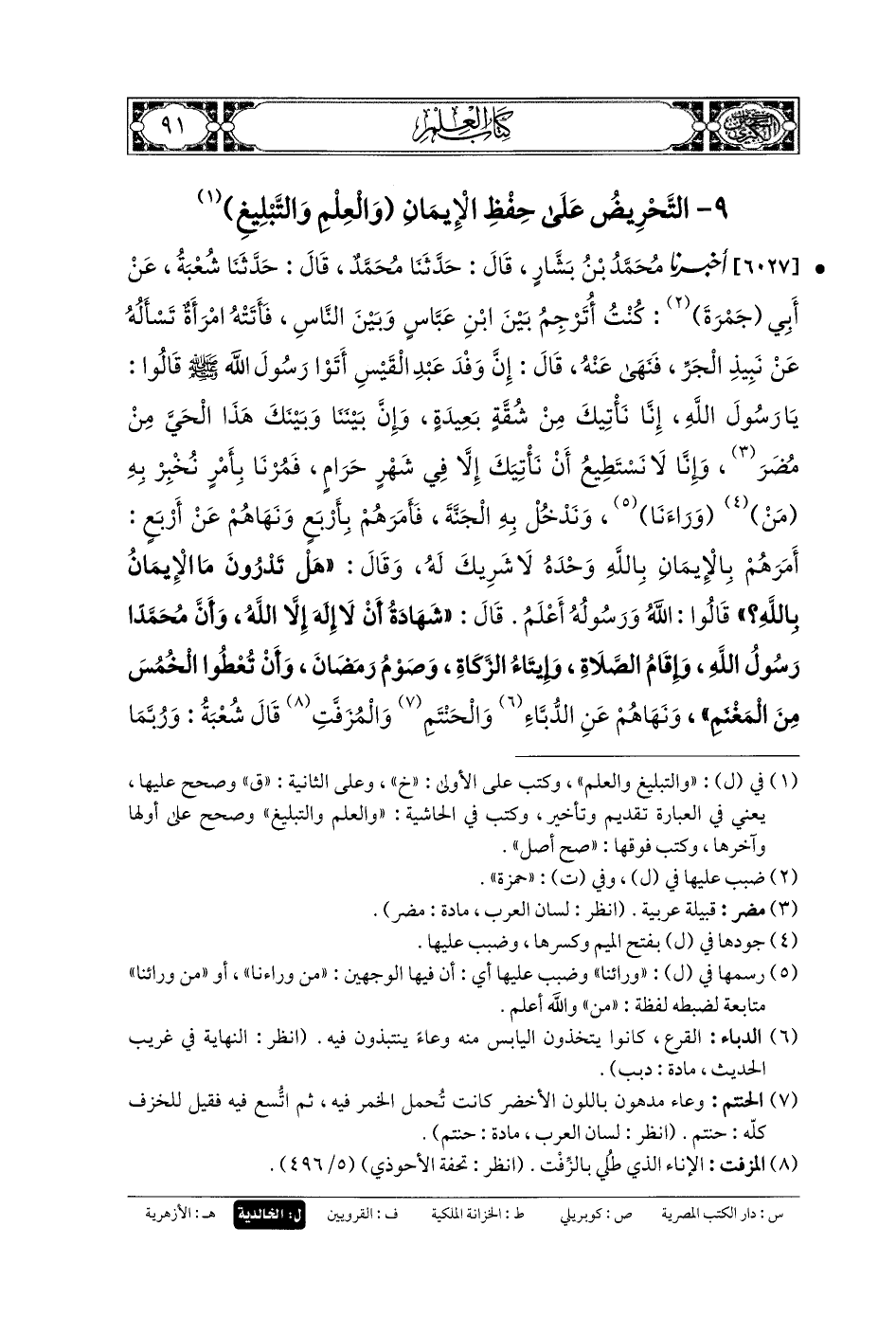 6027- أَخبَرنا مُحَمدُ بنُ بَشَّارٍ، قَالَ: حَدثنا مُحَمدٌ، قَالَ: حَدثنا شُعبَةُ، عَن أَبي جَمْرَةَ: كُنْتُ أُتَرْجِمُ بَيْنَ ابنِ عَبَّاسٍ وَبَيْنَ النَّاسِ، فَأَتَتْهُ امْرَأَةٌ تَسْأَلُهُ عَن نَبِيذِ الجَرِّ، فَنَهَى عَنهُ، قَالَ: إِنَّ وَفْدَ عَبدِ القَيْسِ أَتَوْا رَسُولَ اللهِ صَلى الله عَليه وسَلم قَالُوا: يَا رَسُولَ اللهِ، إِنَّا نَأْتِيكَ مِنْ شُقَّةٍ بَعِيدَةٍ، وَإِنَّ بَيْنَنَا وَبَيْنَكَ هَذَا الحَيُّ مِنْ مُضَرَ، وَإِنَّا لا نَسْتَطِيعُ أَنْ نَأْتِيَكَ إِلاَّ فِي شَهْرٍ حَرَامٍ، فَمُرْنَا بِأَمْرٍ نُخْبِرْ بِهِ مَنْ وَرَاءَنَا، وَنَدْخُلْ بِهِ الجَنَّةَ، فَأَمَرَهُمْ بِأَرْبَعٍ، وَنَهَاهُمْ عَن أَرْبَعٍ: أَمَرَهُمْ بِالإِيمَانِ بِاللهِ وَحْدَهُ لا شَرِيكَ لَهُ، وَقَالَ: هَلْ تَدْرُونَ مَا الإِيمَانُ بِاللهِ؟ قَالُوا: اللهُ وَرَسُولُهُ أَعْلَمُ، قَالَ: شَهَادَةُ أَنَّ لا إِلَهَ إِلاَّ اللهُ، وَأَنَّ مُحَمدًا رَسُولُ اللهِ، وَإِقَامُ الصَّلاةِ، وَإِيتَاءُ الزَّكَاةِ، وَصَوْمُ رَمَضَانَ، وَأَنْ تُعْطُوا الخُمُسَ مِنَ المَغْنَمِ، وَنَهَاهُمْ عَنِ الدُّبَّاءِ، وَالحَنْتَمِ، وَالمُزَفَّتِ، قَالَ شُعبَةُ: وَرُبَّمَا قَالَ: النَّقِيرُ، وَرُبَّمَا قَالَ: المُقَيَّرُ، فَقَالَ: احْفَظُوهُ، وَأَخْبِرُوا بِهِ مَنْ وَرَاءَكُمْ.